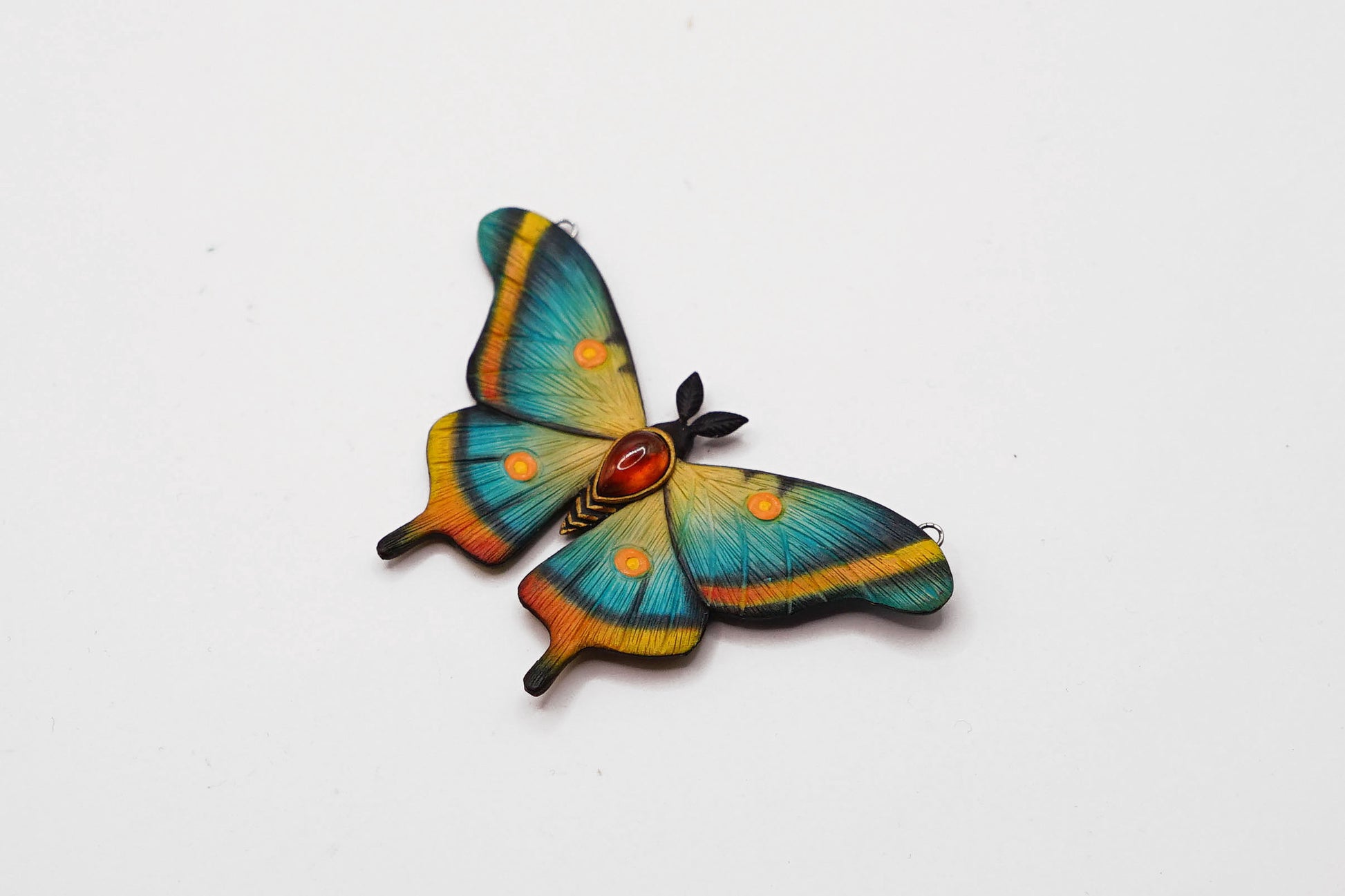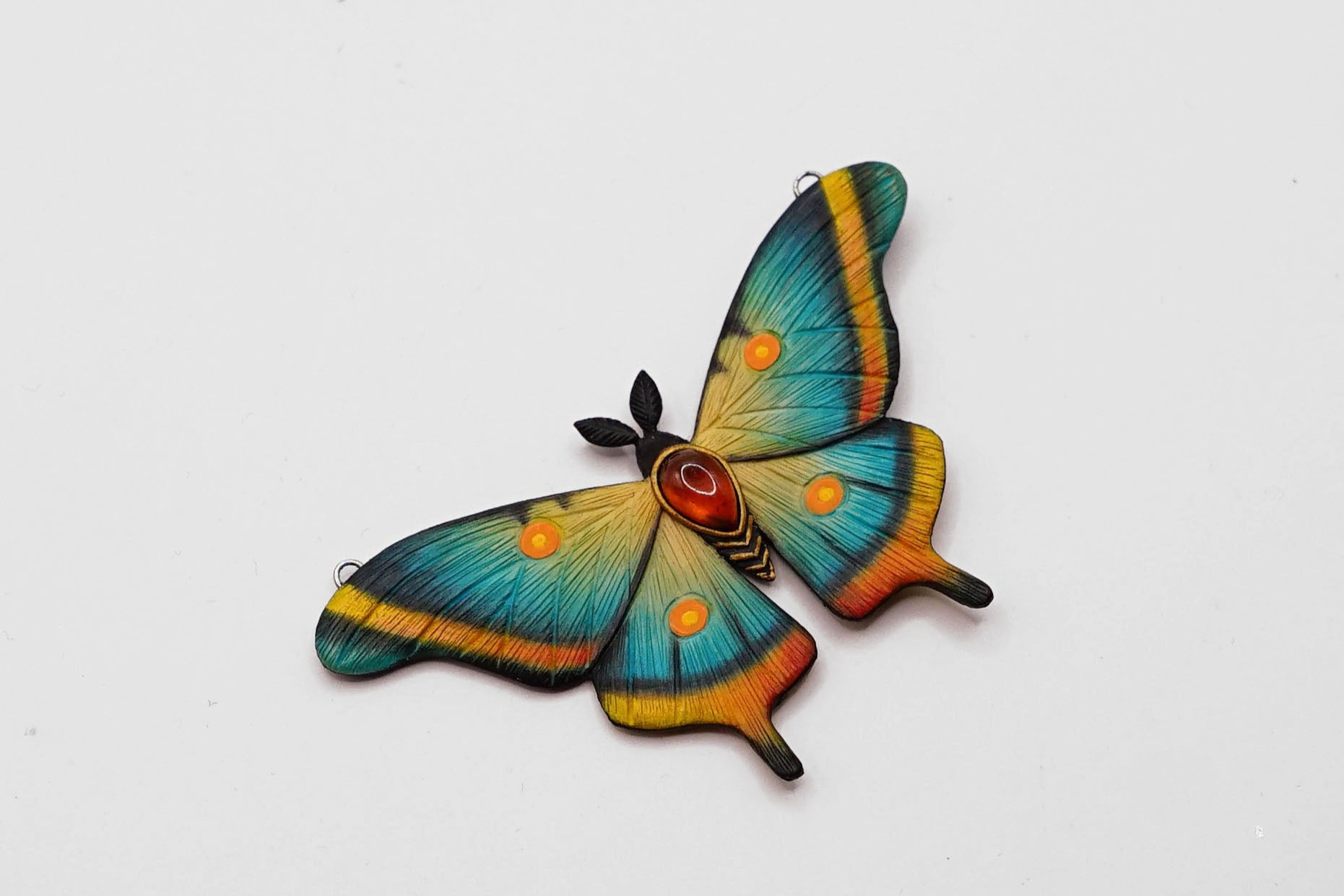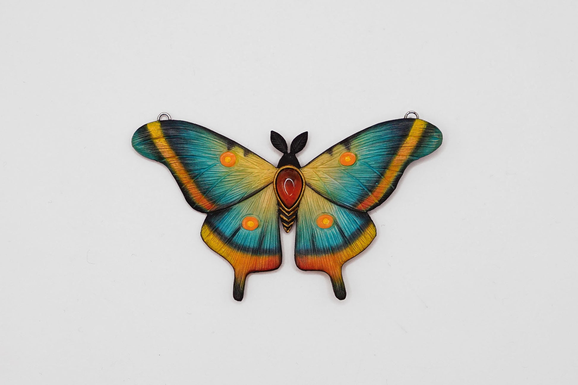 Hand-sculpted from polymer clay and painted with vibrant pastels, this colorful moth pendant is ready to brighten any outfit. Each wing is carefully textured and detailed, bringing the piece to life.