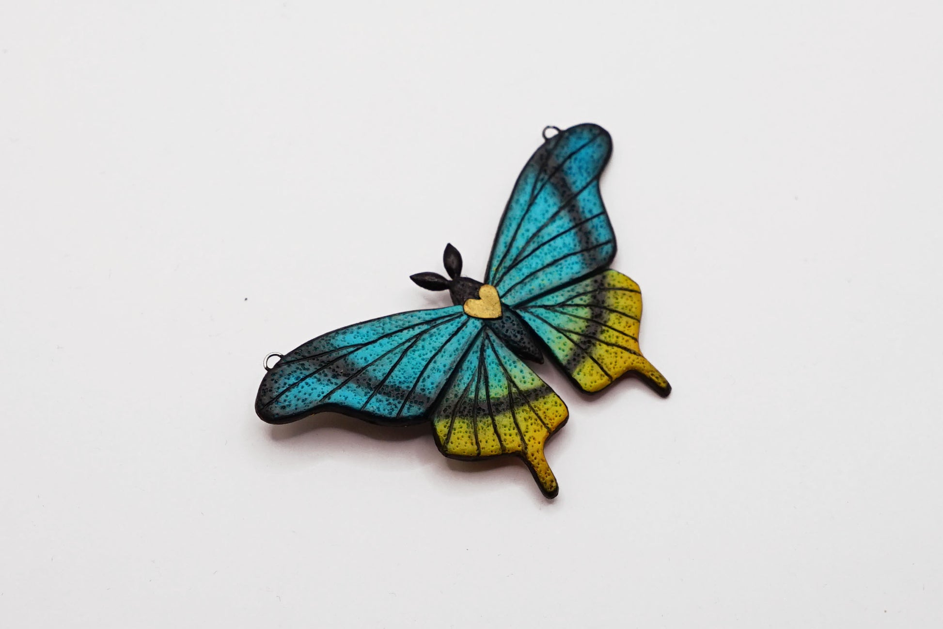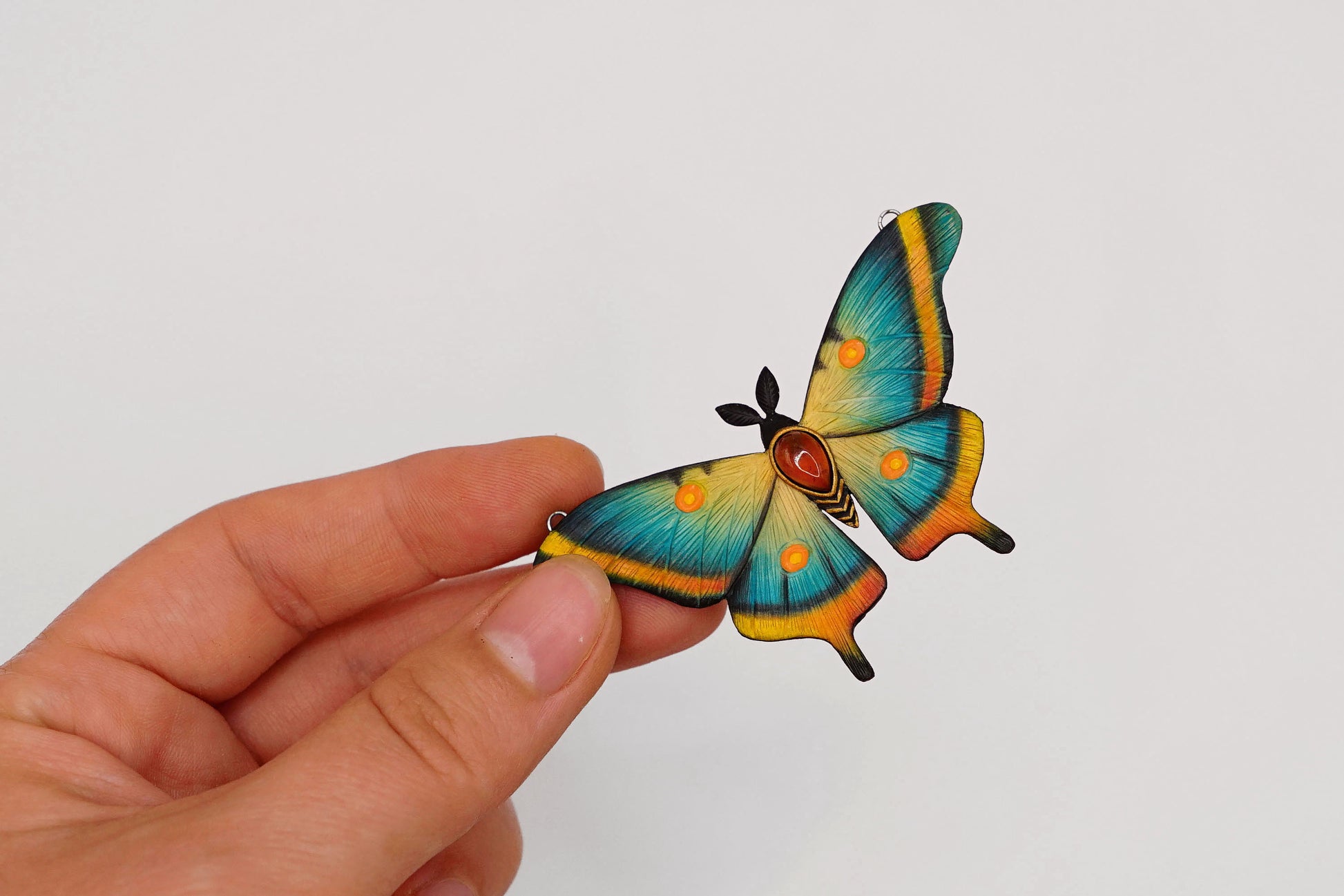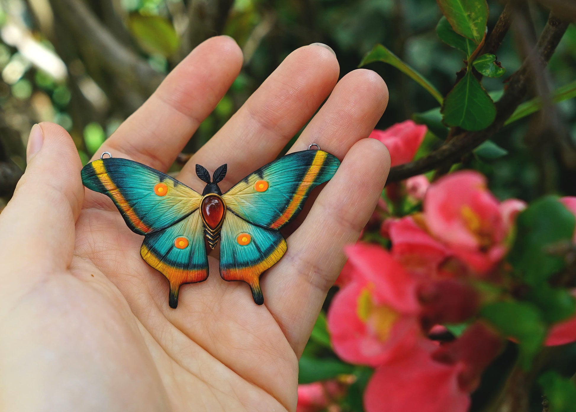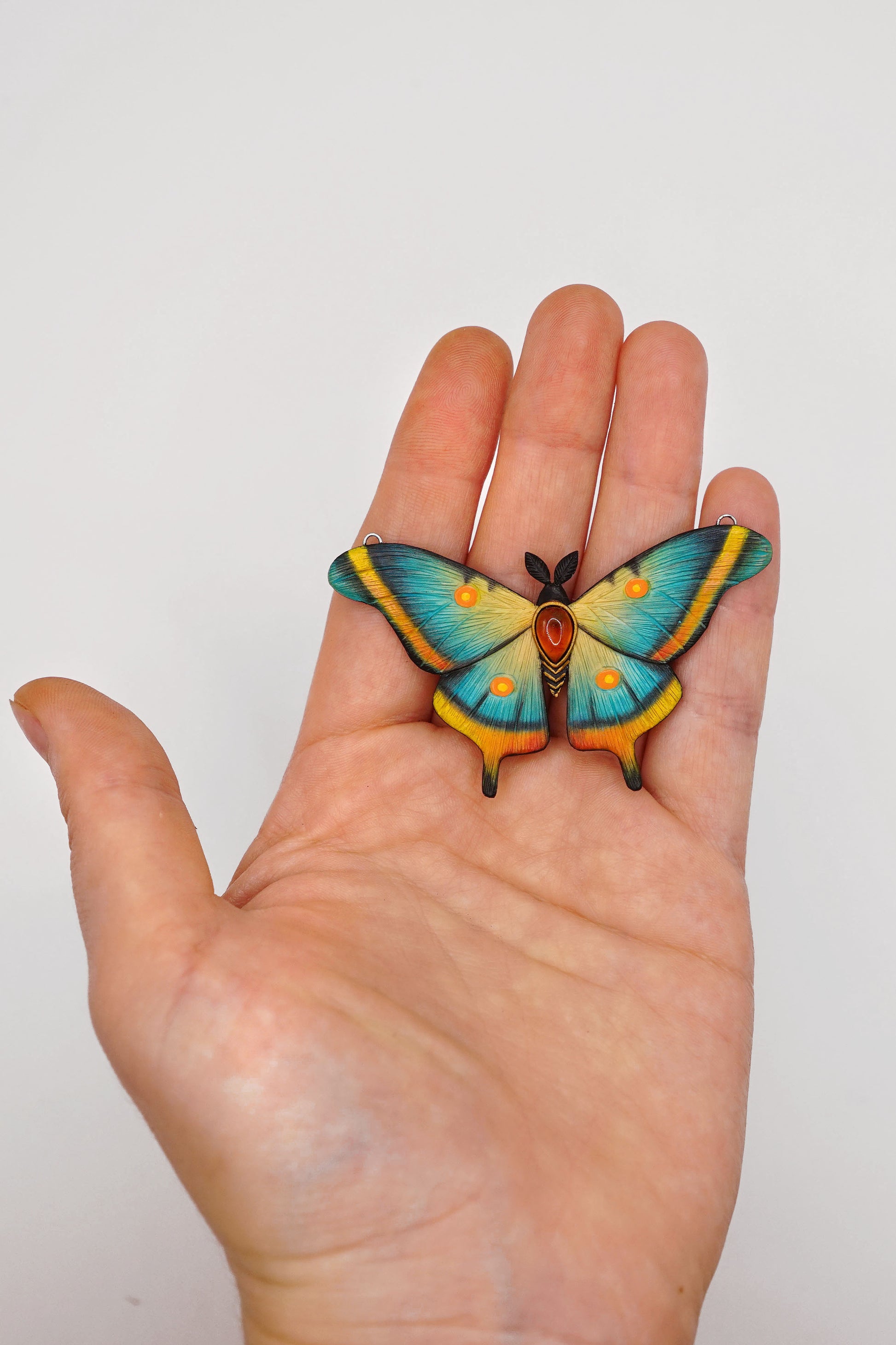 Hand-sculpted from polymer clay and painted with vibrant pastels, this colorful moth pendant is ready to brighten any outfit. Each wing is carefully textured and detailed, bringing the piece to life.