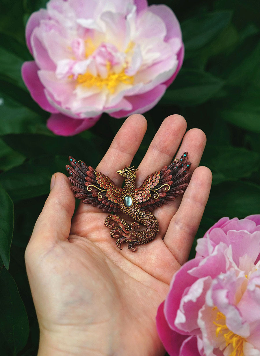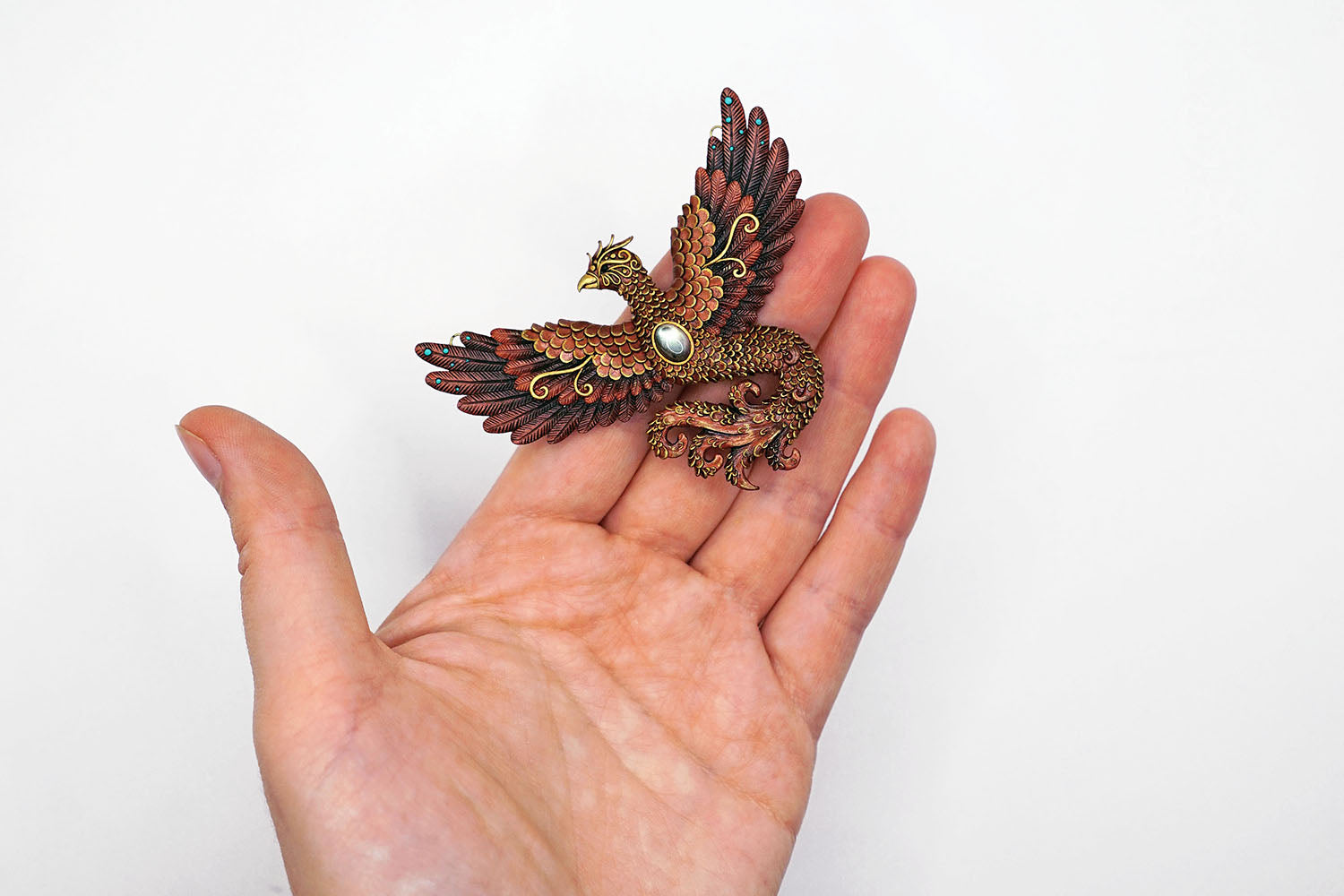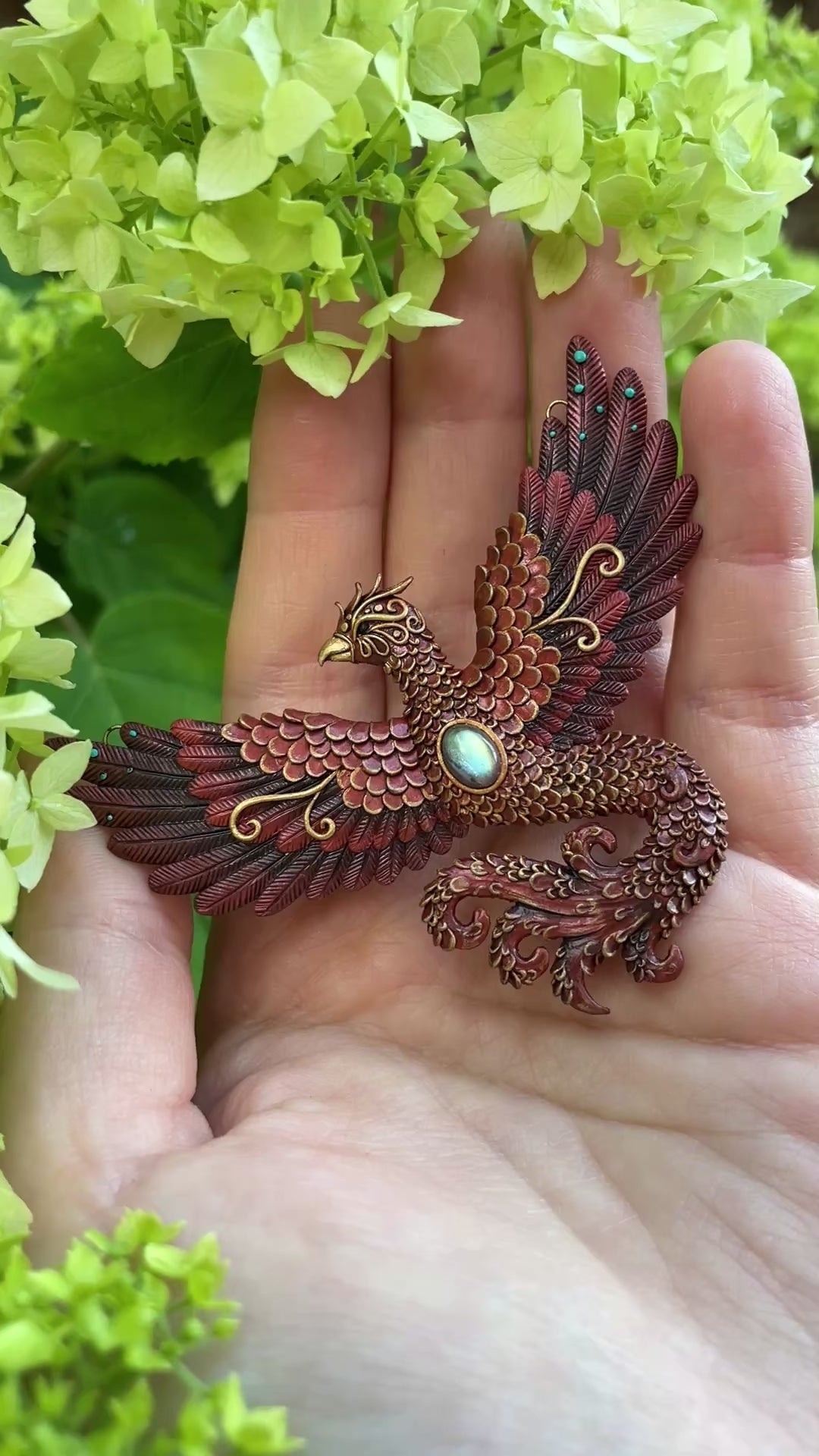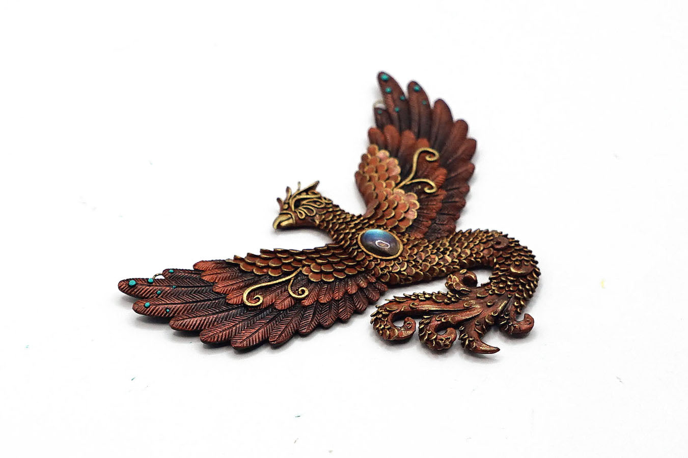 This small phoenix pendant is meticulously handcrafted from polymer clay, embodying the legendary bird's symbolism of renewal and resilience. The pendant features intricate details and displays a tiny labradorite at its center, adding a touch of magic. The copper tones and gold accents give the piece a metallic look.