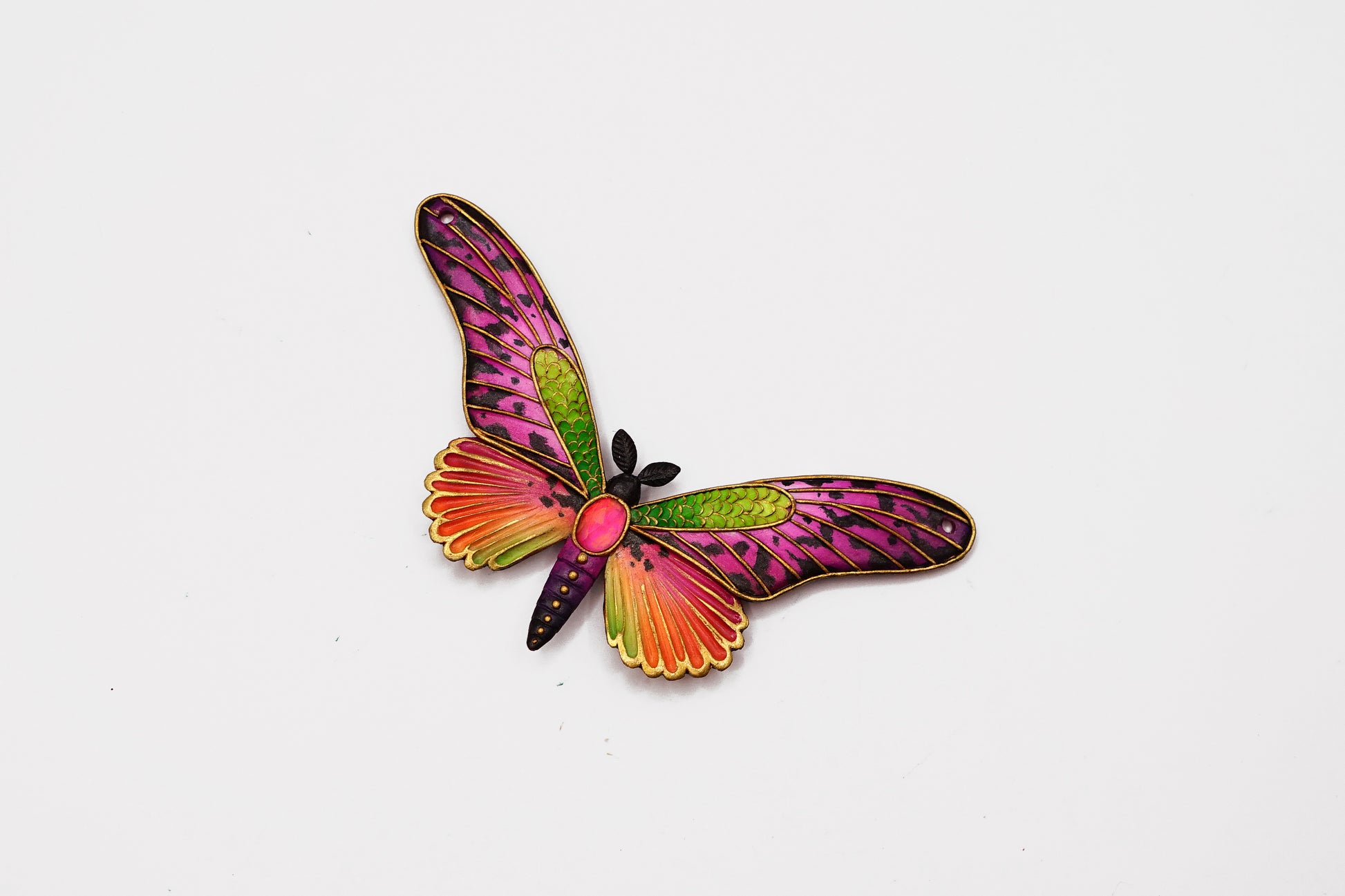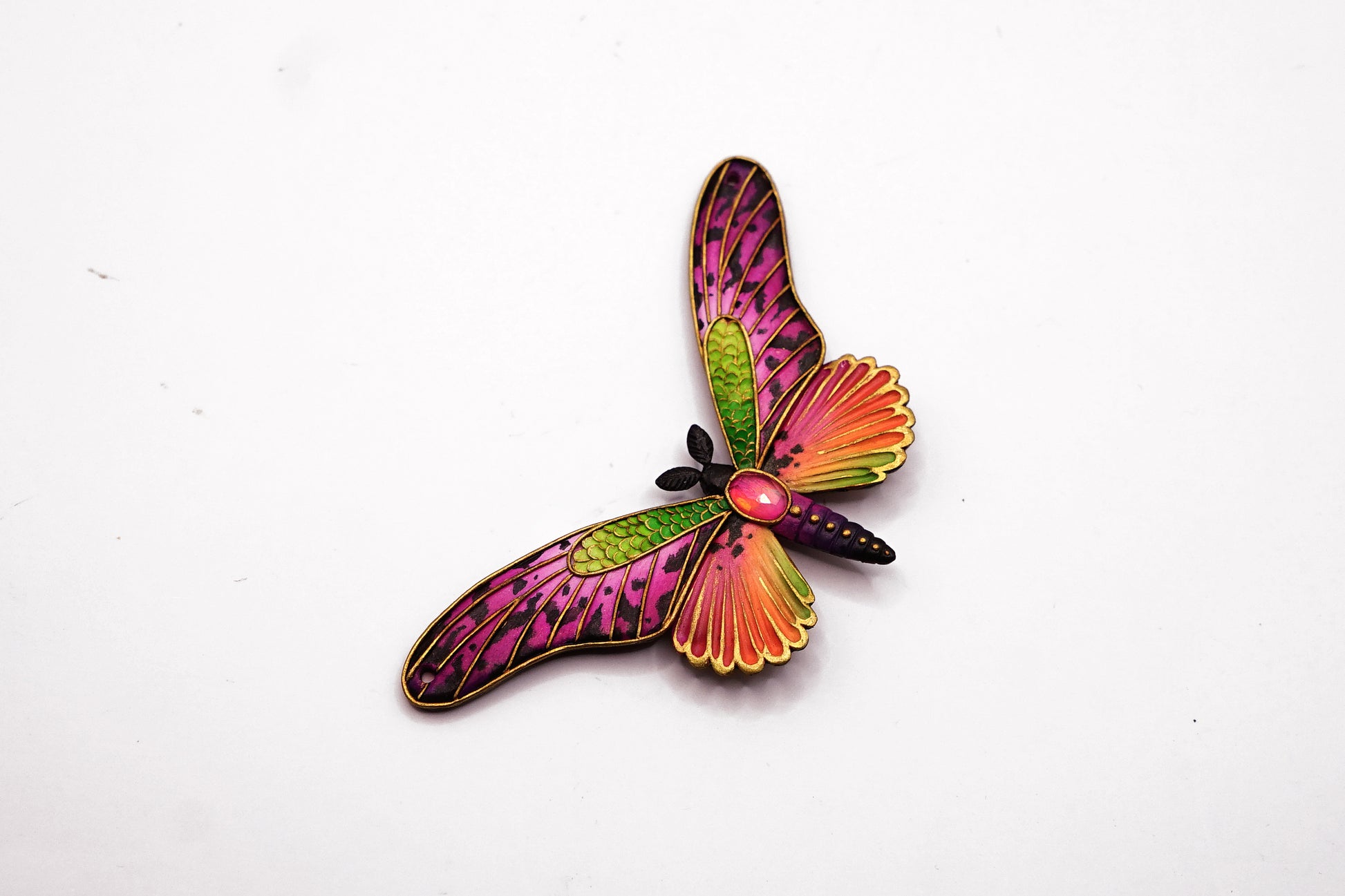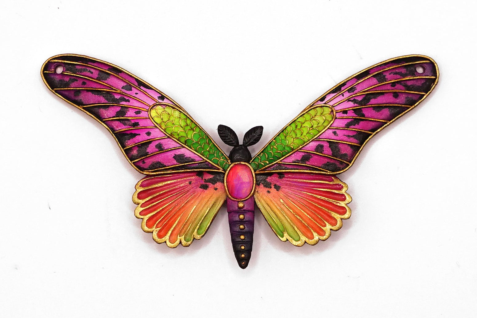 The front side showcases an eye-catching blend of vivid colors, meticulous details, and a striking aurora opal. The wings are colored with bright magenta, green, orange, and gold hues, creating a joyful (& slightly retro) look. The delicate details of the scales on the wings and the textured body add depth and realism.