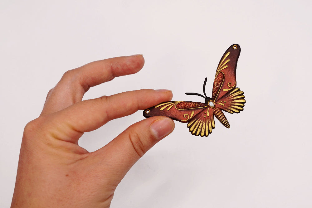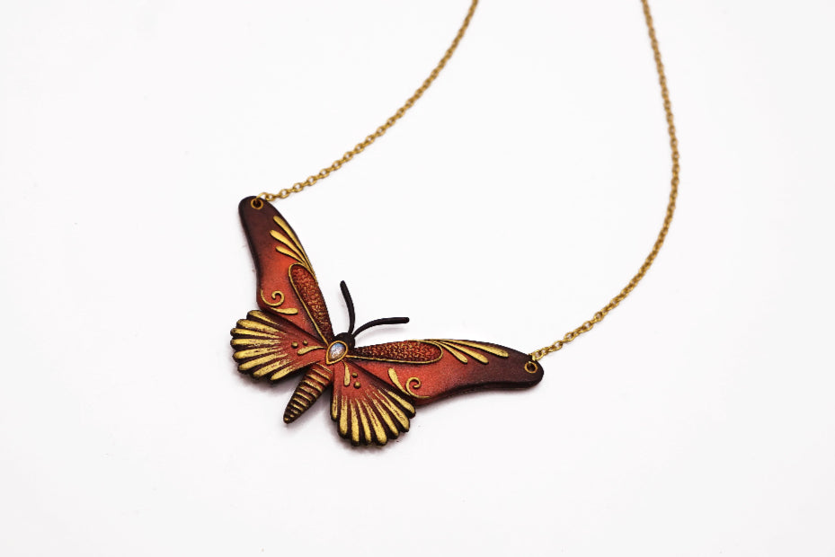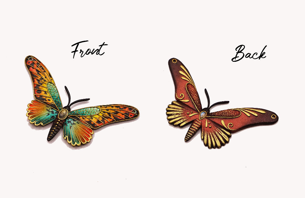 The back side showcases a rich, earthy color palette with predominantly copper and gold hues. The wings are decorated with delicate golden embellishments and swirls. At the center of the butterfly there's a tiny labradorite that adds a touch of elegance and a bit of contrast. The overall design on the back gives the pendant a vintage or antique feel.