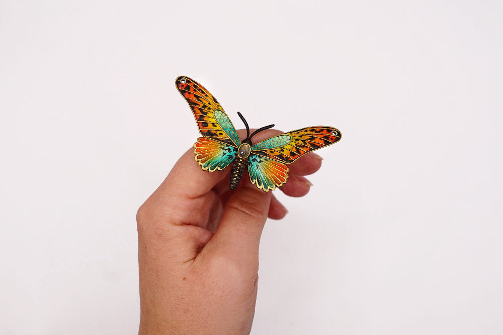 The front side has a vibrant and intricate design. It is colored with a range of pigments, including shades of orange, yellow, red, and teal, accented with black spots and gold lines. The center of the butterfly features a labradorite. The overall effect is colorful and eye-catching, resembling a realistic, yet artistically interpreted, butterfly.