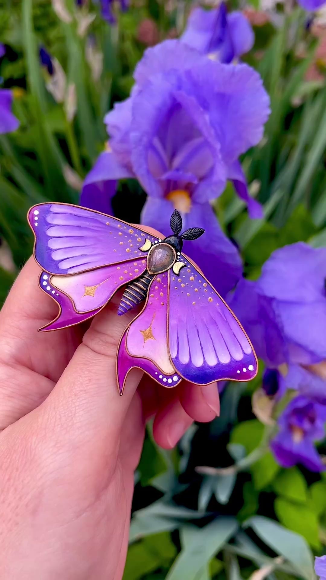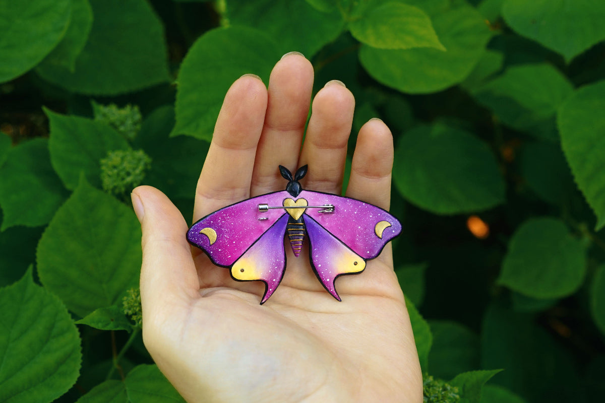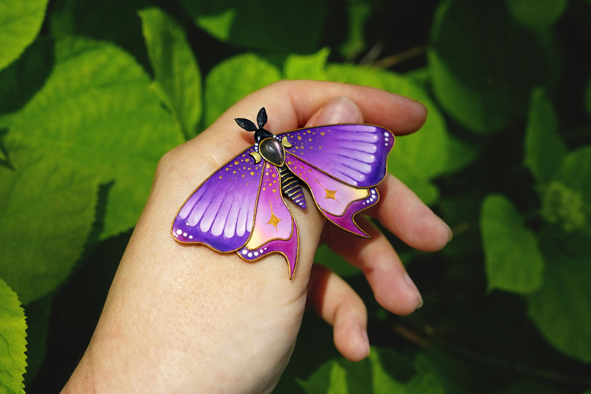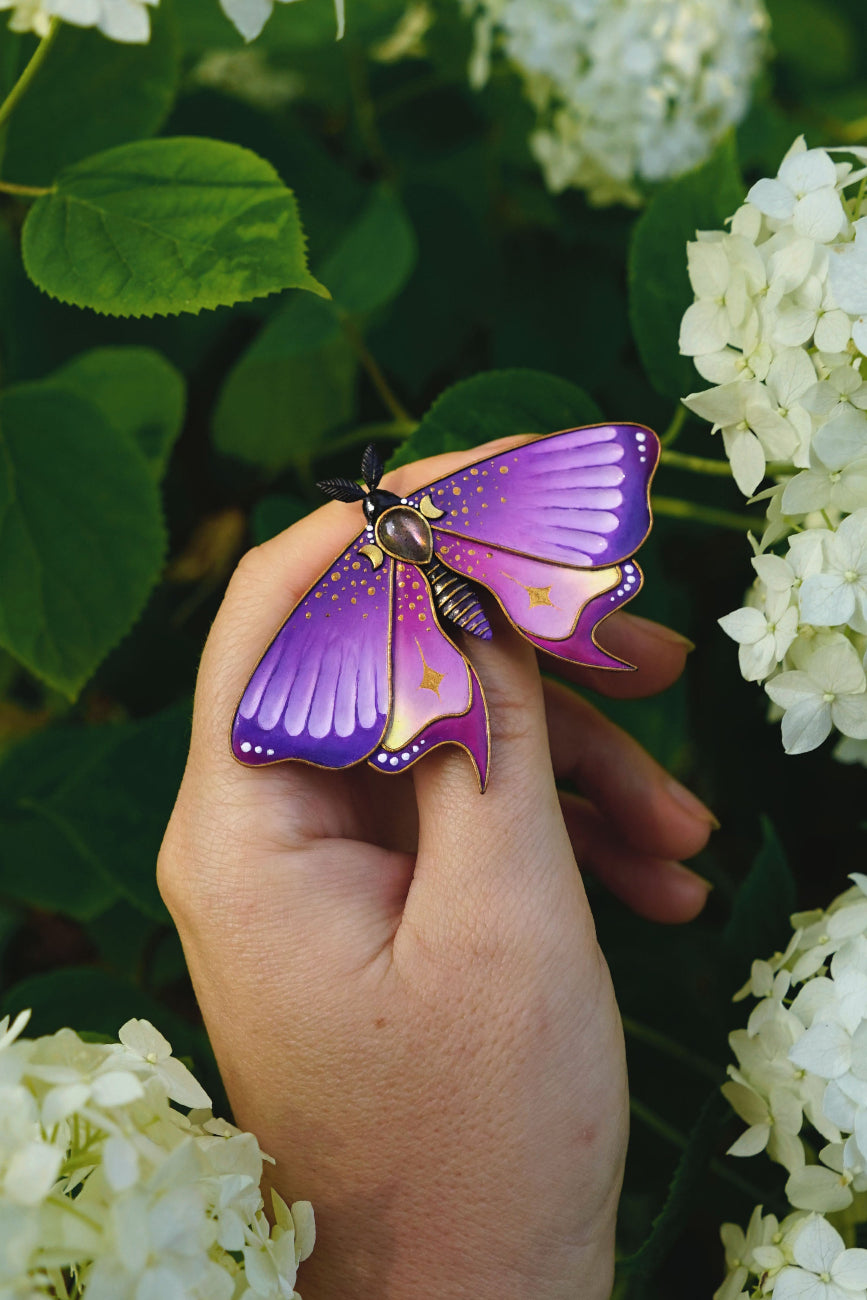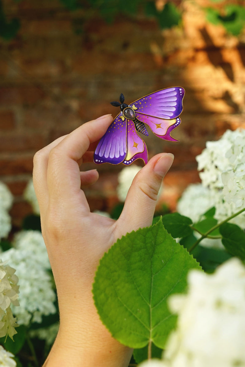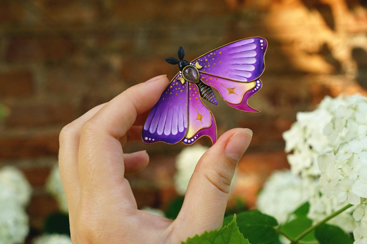 A magical-looking moth brooch colored in tones of purple, with a touch of gold. Her name is Dramethysta.