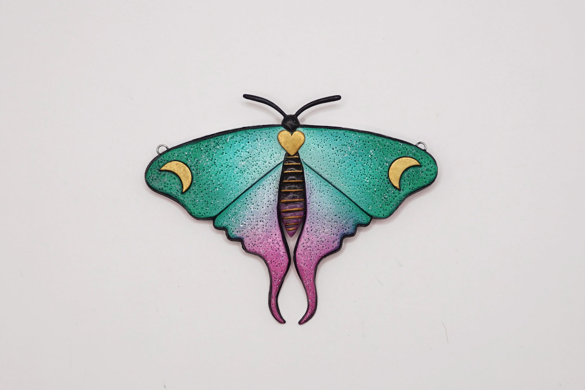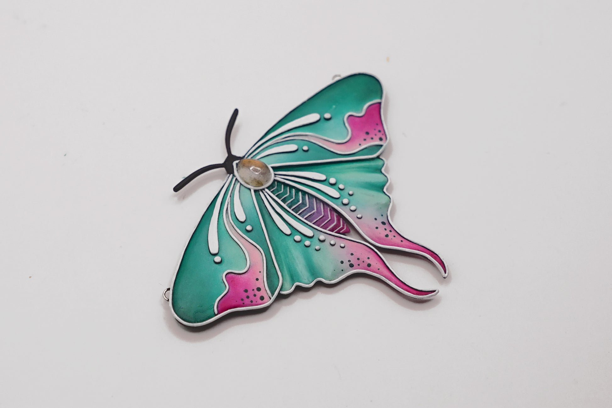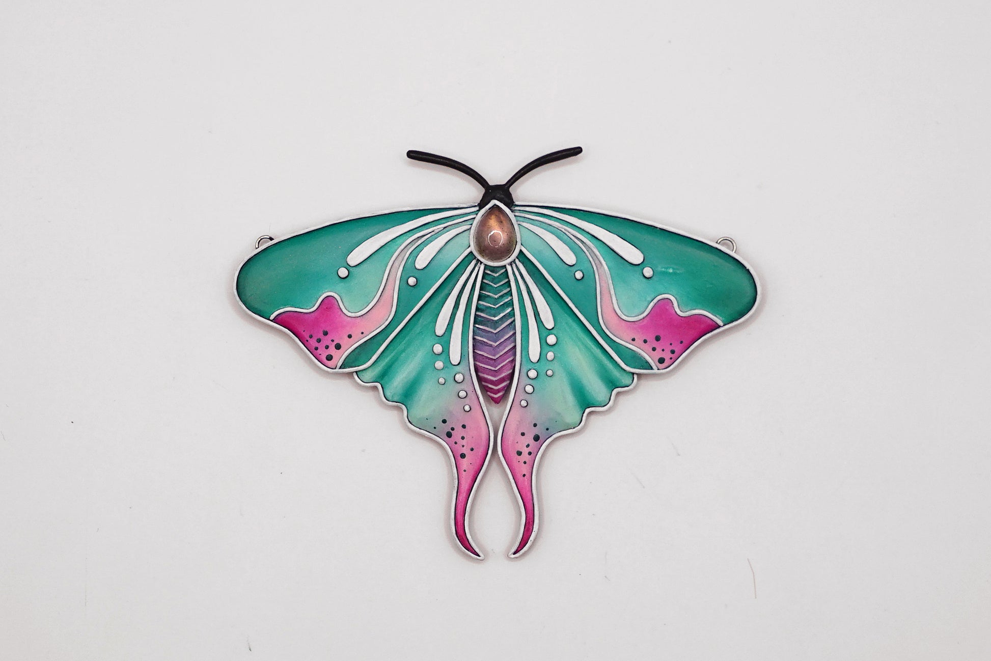 This hand-sculpted moth pendant blends fresh minty greens with soft pink and magenta tones, beautifully complemented by a small pink labradorite. The color transitions and wavy lines give it a delicate, whimsical feel.