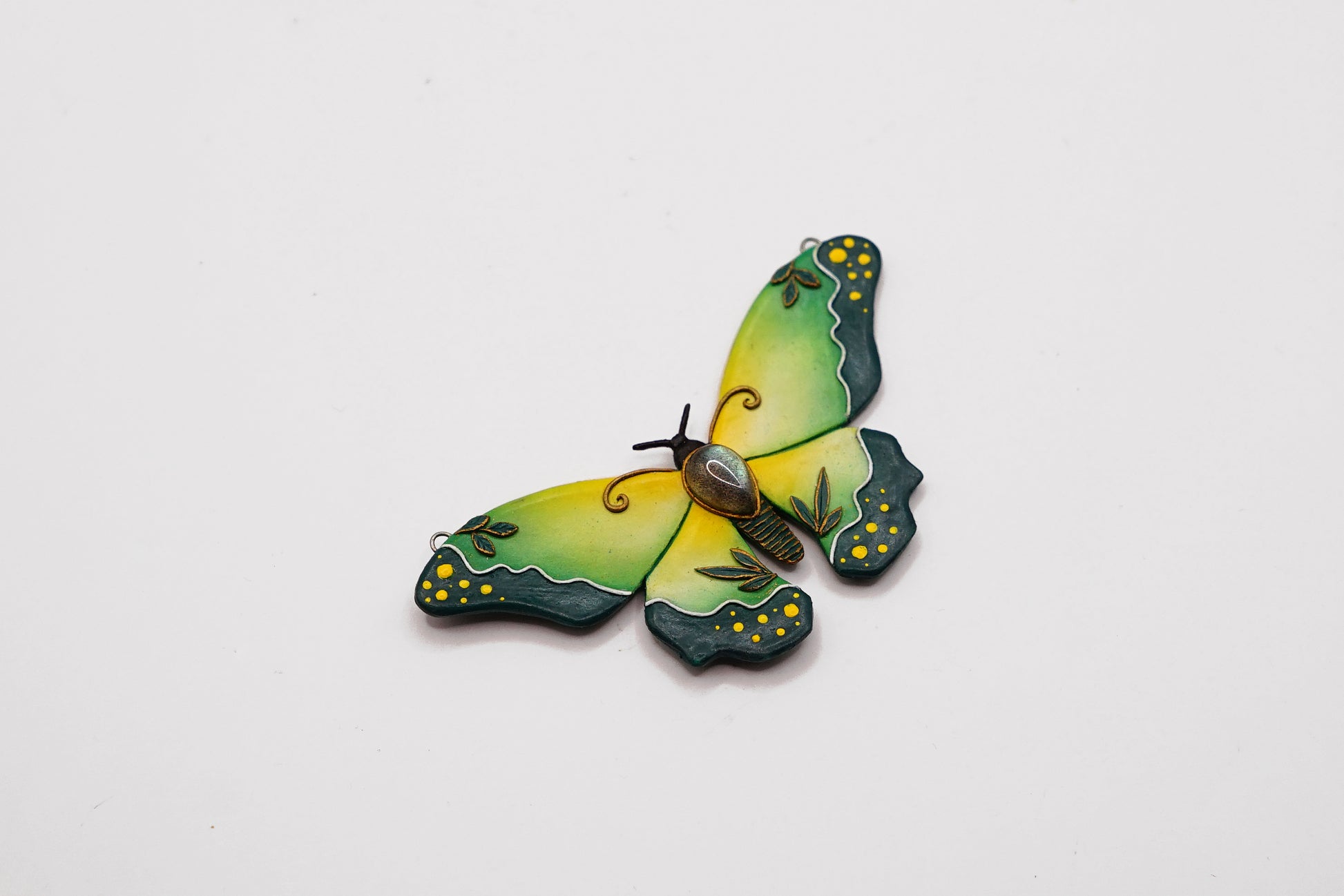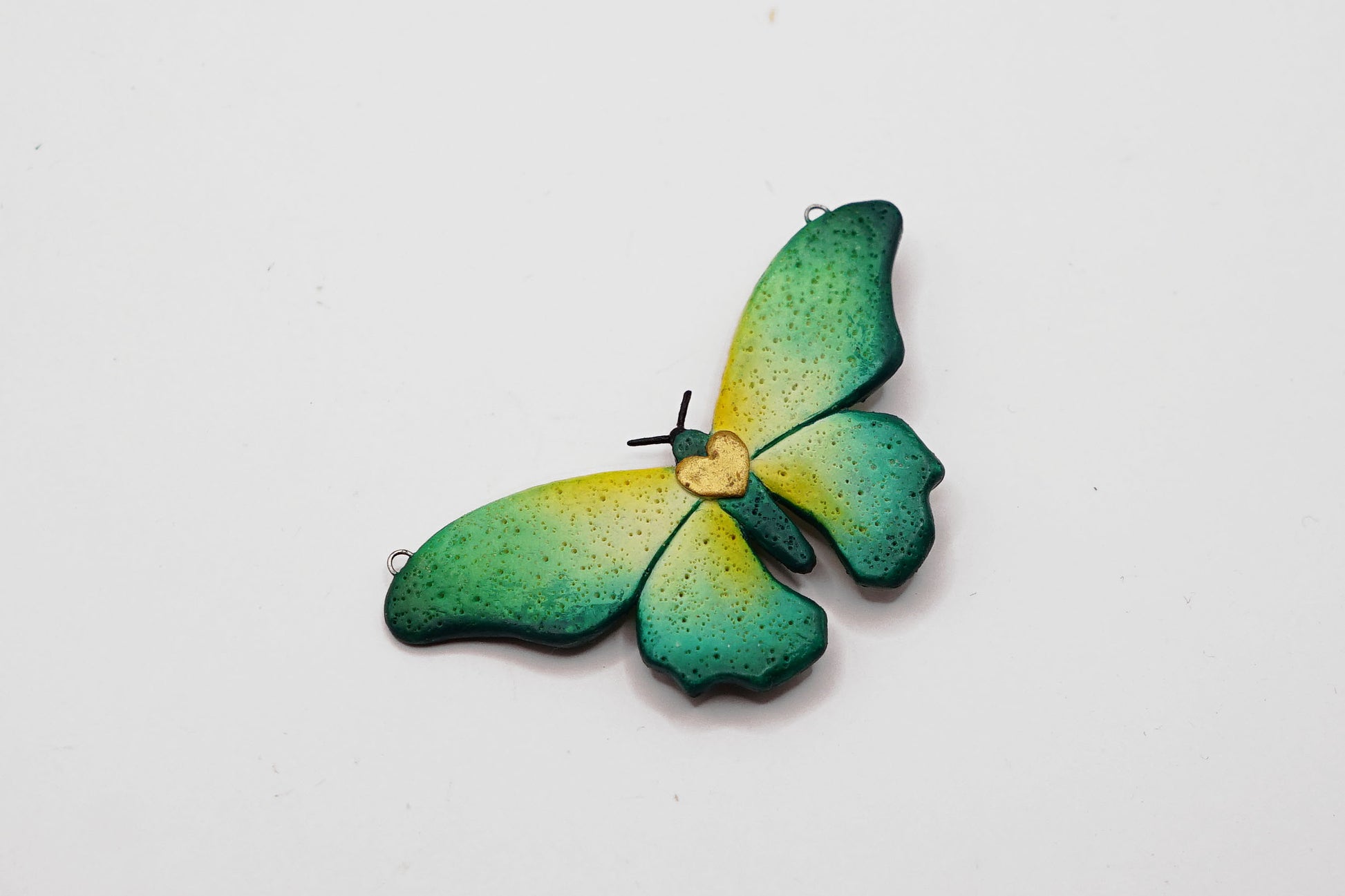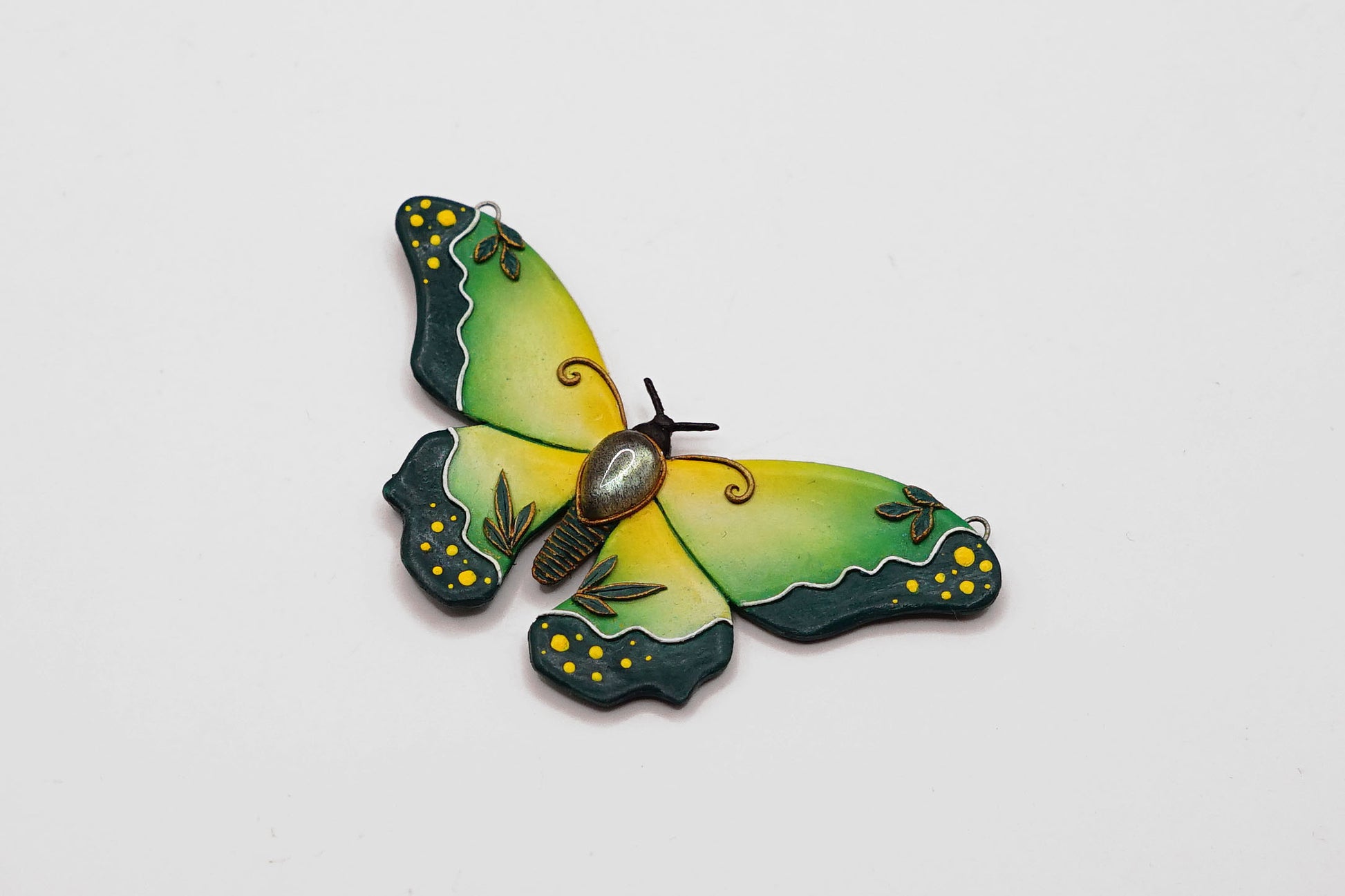Hand-sculpted from polymer clay and painted with vibrant pastels and acrylic paints, this butterfly pendant will add a playful touch to your outfit.