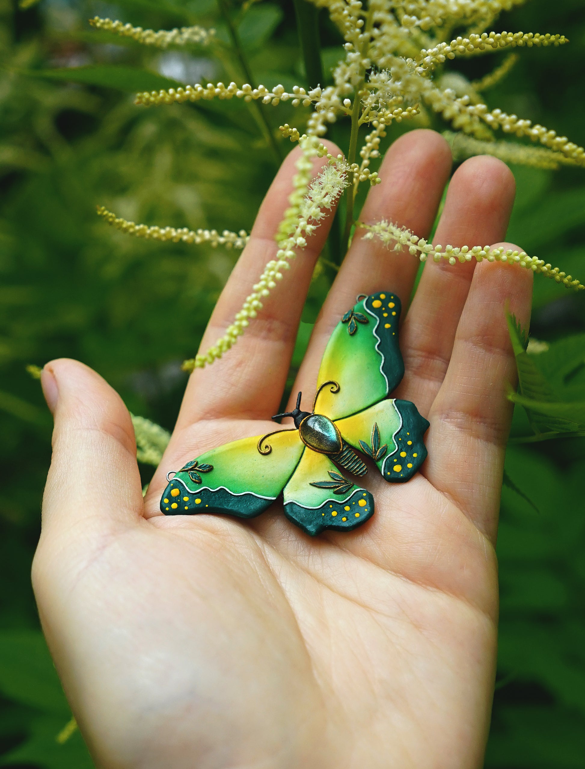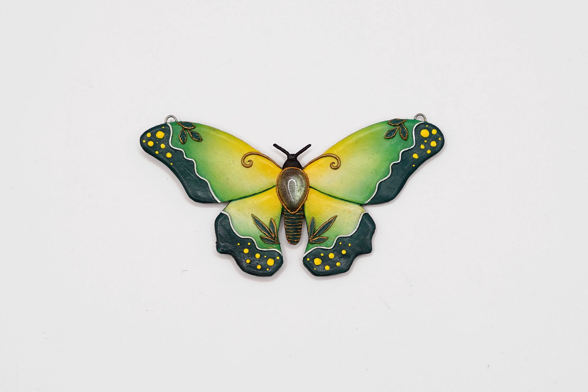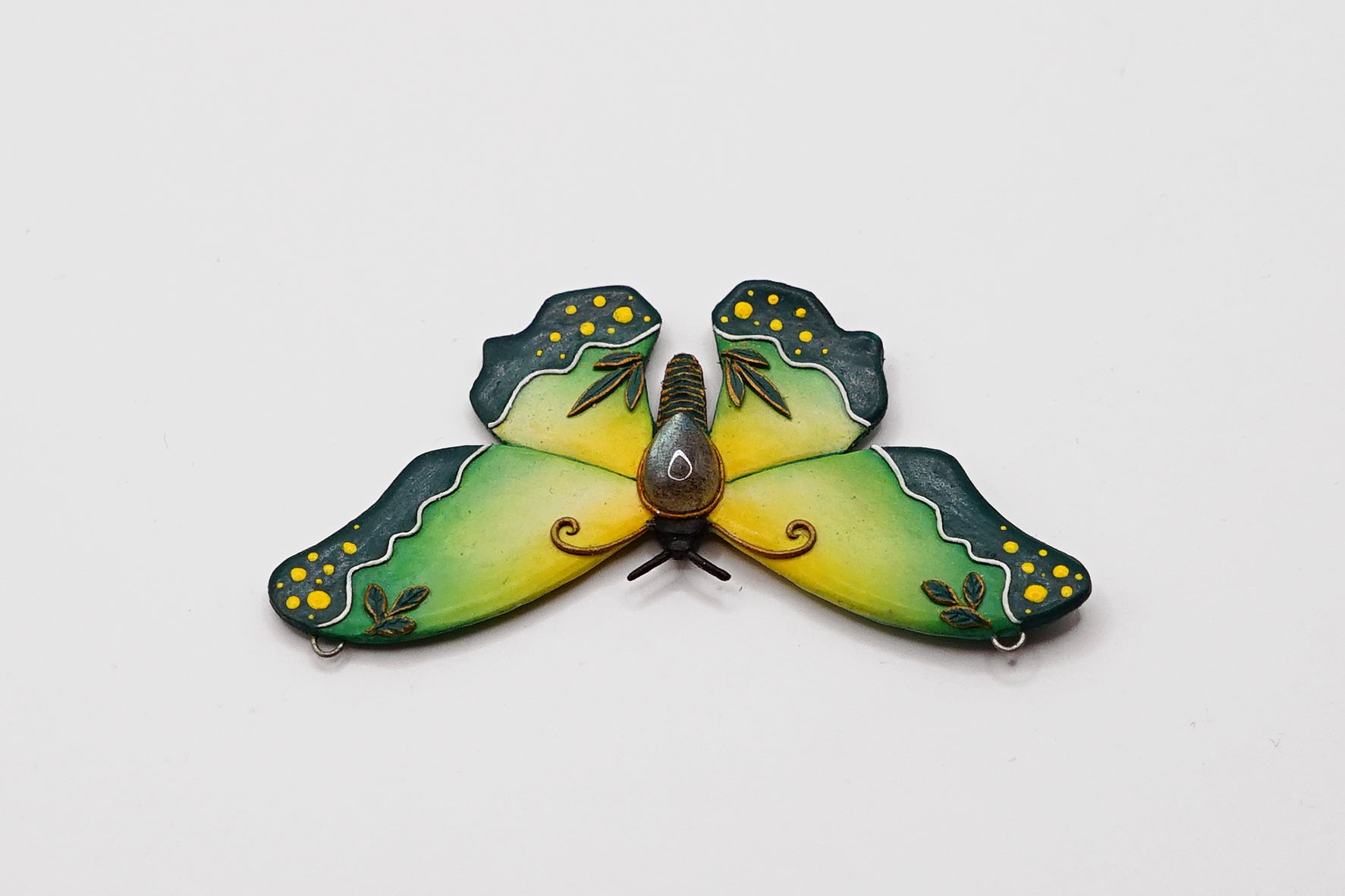 Hand-sculpted from polymer clay and painted with vibrant pastels and acrylic paints, this butterfly pendant will add a playful touch to your outfit.