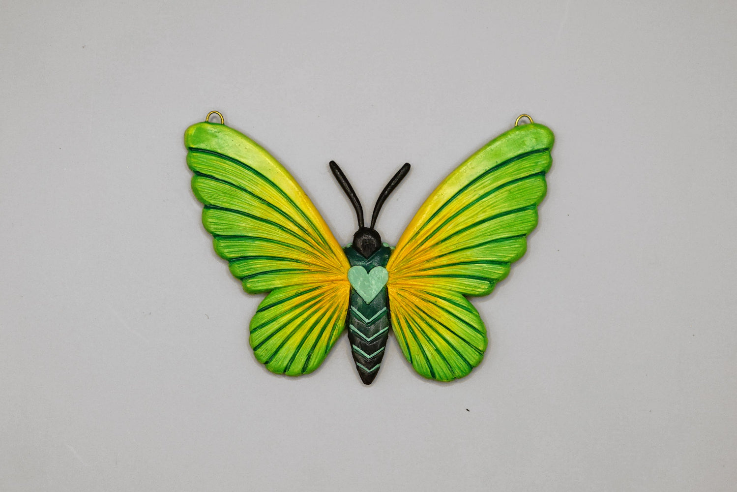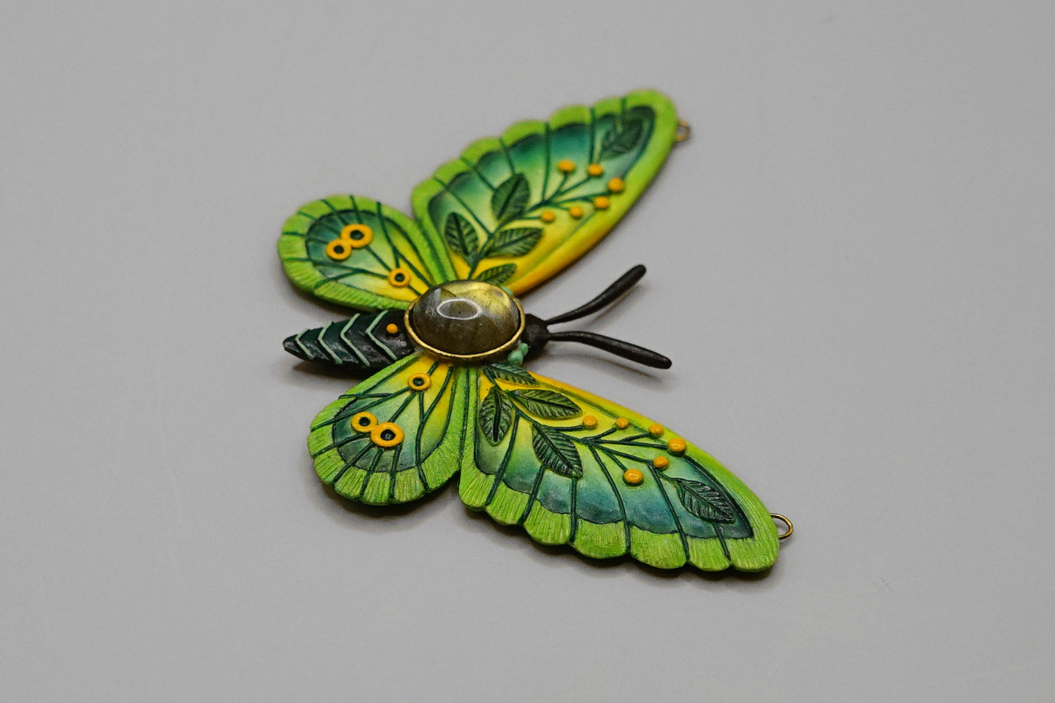 This butterfly pendant is crafted from polymer clay and features a labradorite cabochon. The wings are filled with hand-sculpted botanical motifs and decorative details, finished in shades of green and yellow. Carefully layered color brings out the sculpted textures, while the labradorite adds depth with subtle flashes beneath the surface.