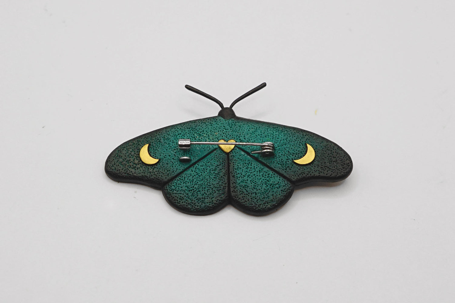 This brooch evokes the feeling of stepping into a woodland where light barely reaches the ground. The wings are colored in green tones and muted earth tones, with dark markings that create a symmetrical pattern. At the center, a labradorite brings subtle flashes of green and blue, shifting with movement like light breaking through leaves. This brooch is entirely handmade from polymer clay and finished with careful detailing, designed to be worn as a wearable piece that carries a quiet, grounded presence.