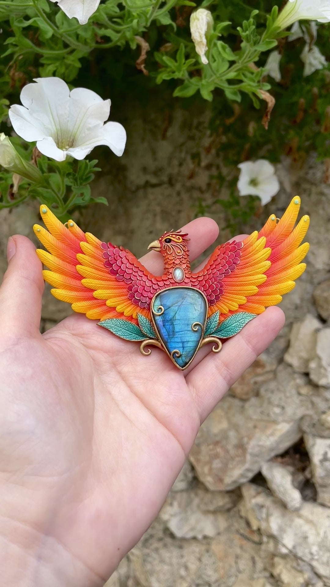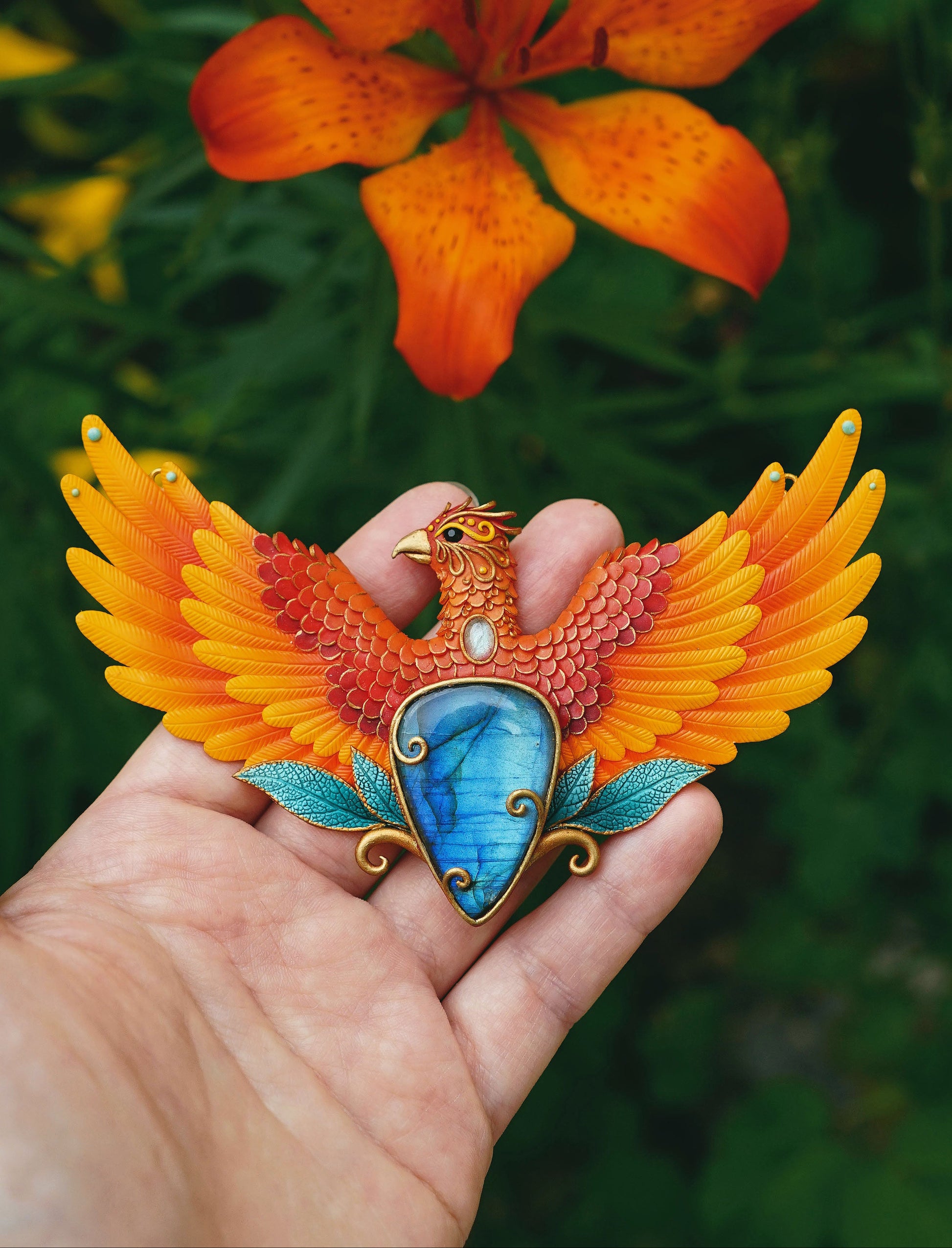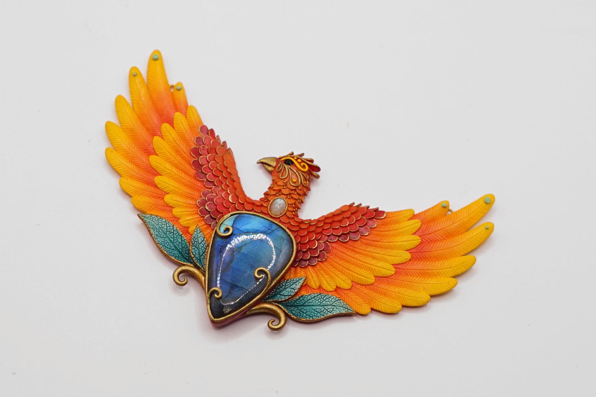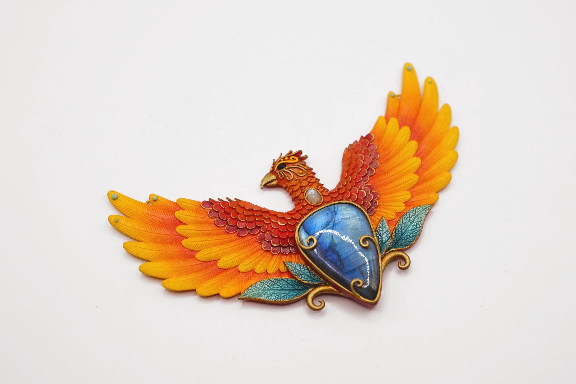 This vibrant phoenix pendant is intricately sculpted with detailed feather patterns, ranging from bright yellow and orange to deep red, capturing the mythical creature's fiery essence. A touch of teal is added for contrast, making the piece even more eye-catching. The two labradorite gemstones set at the center of the phoenix add a mystical vibe to the piece.