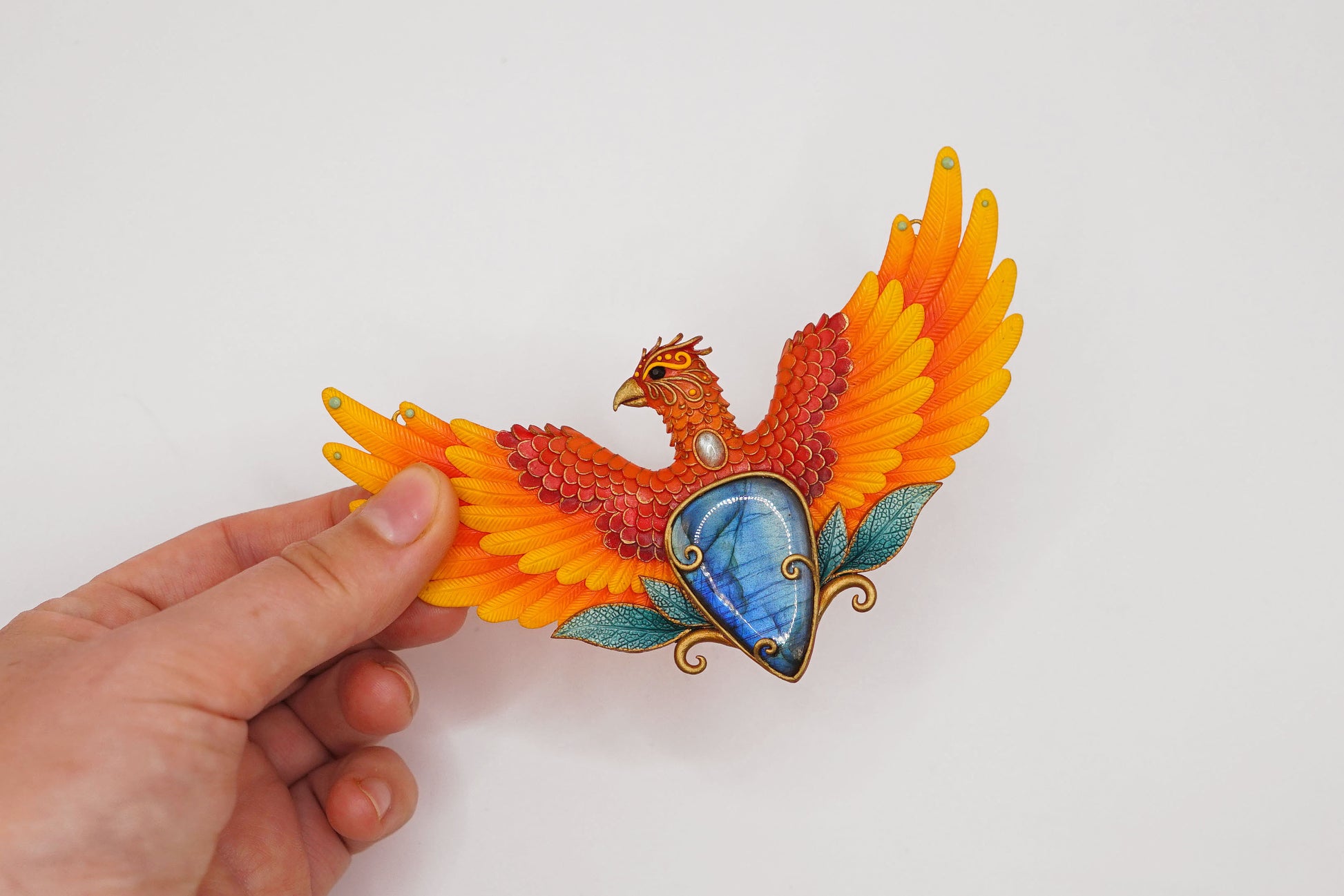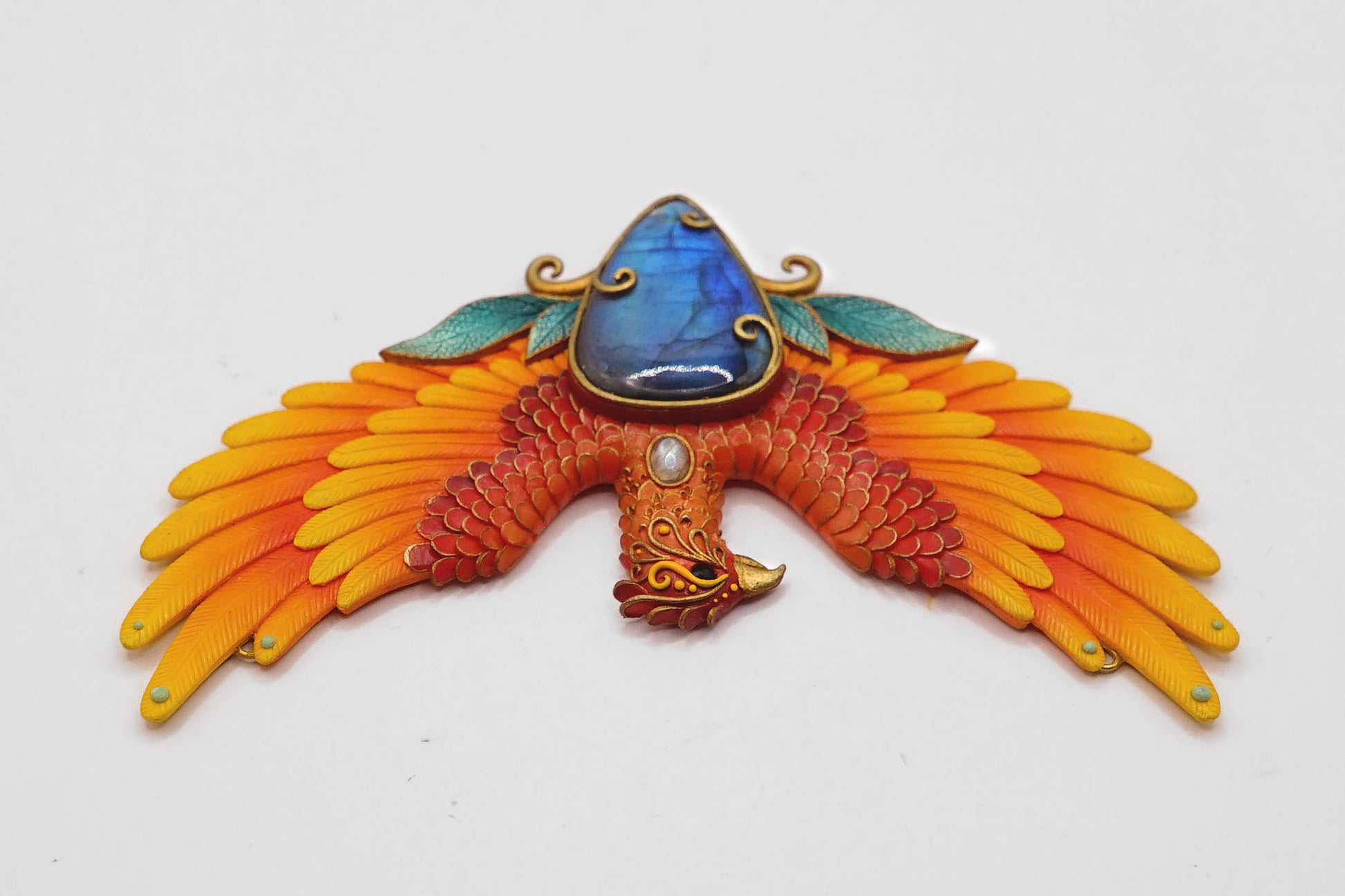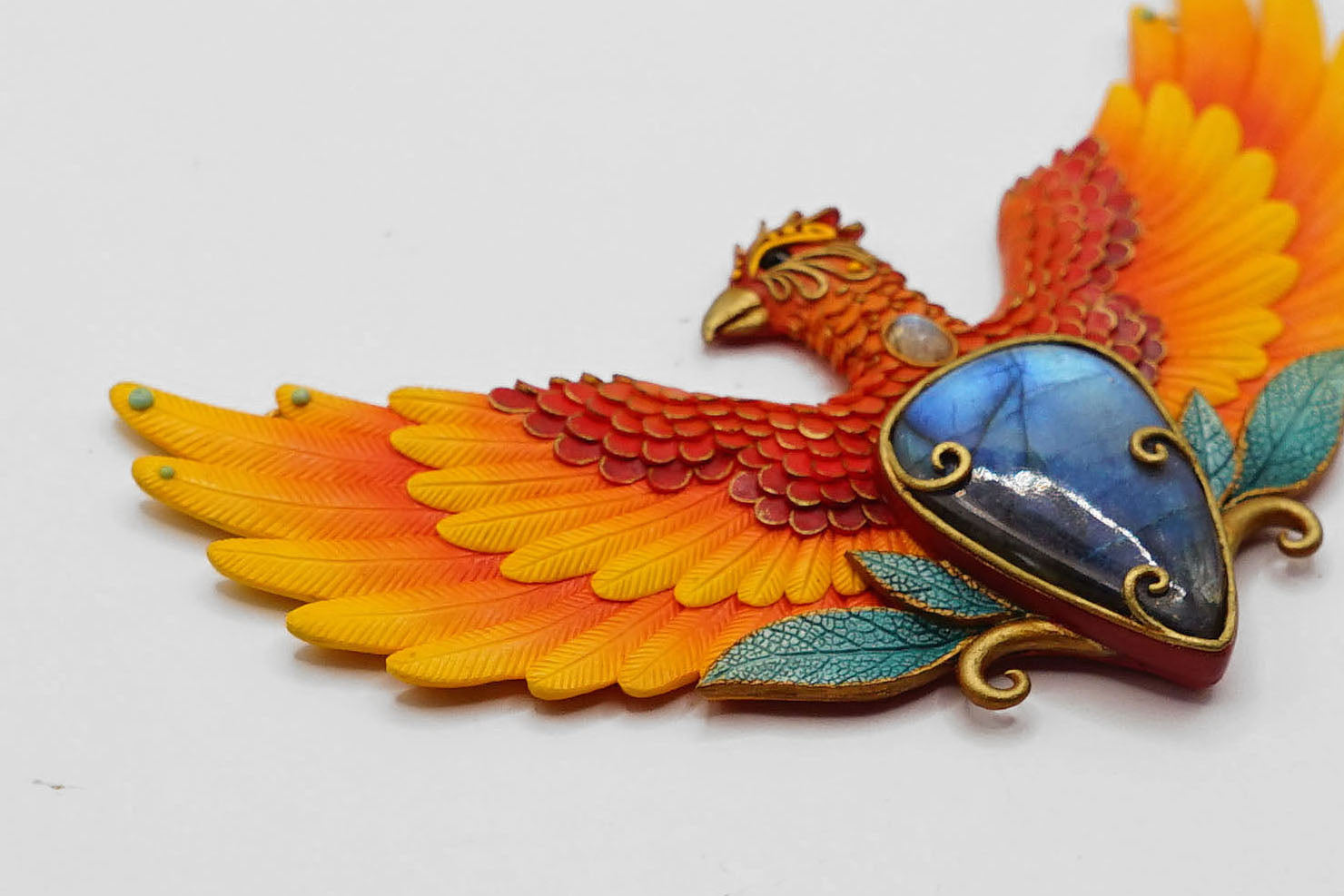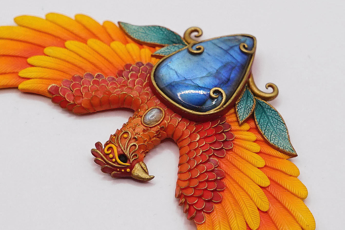 This vibrant phoenix pendant is intricately sculpted with detailed feather patterns, ranging from bright yellow and orange to deep red, capturing the mythical creature's fiery essence. A touch of teal is added for contrast, making the piece even more eye-catching. The two labradorite gemstones set at the center of the phoenix add a mystical vibe to the piece.