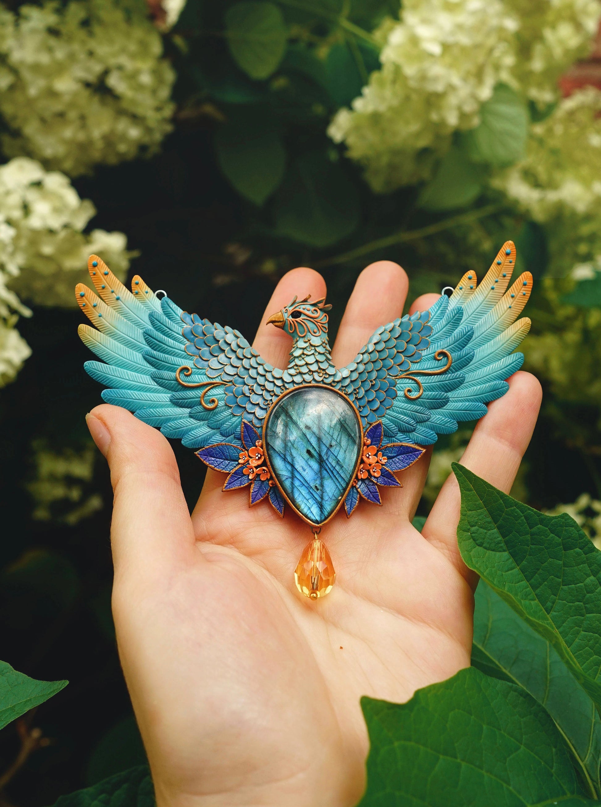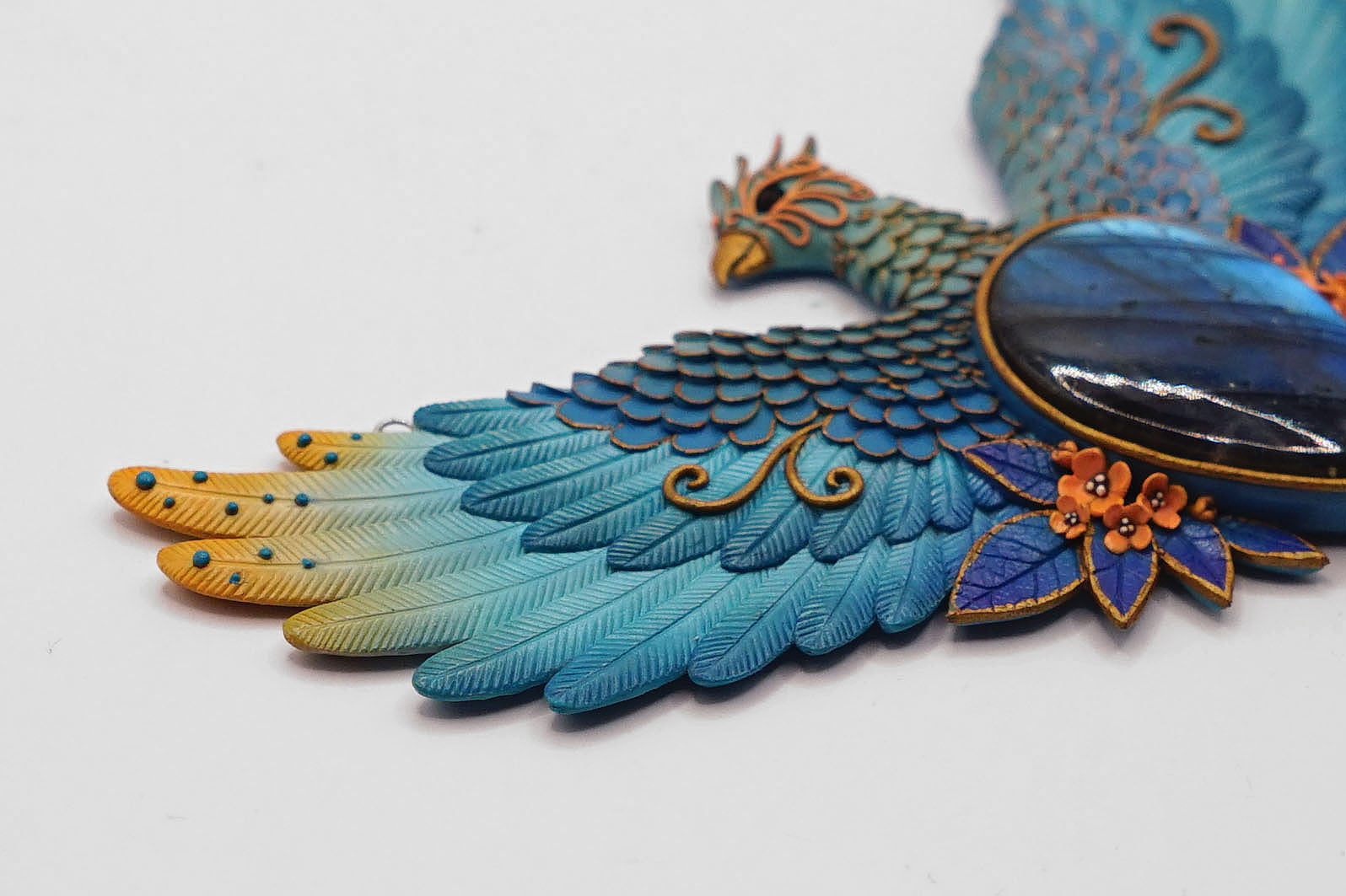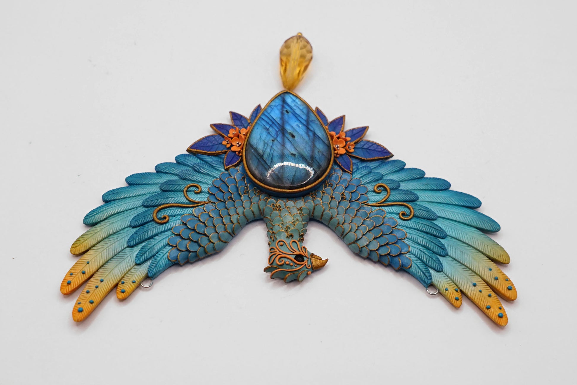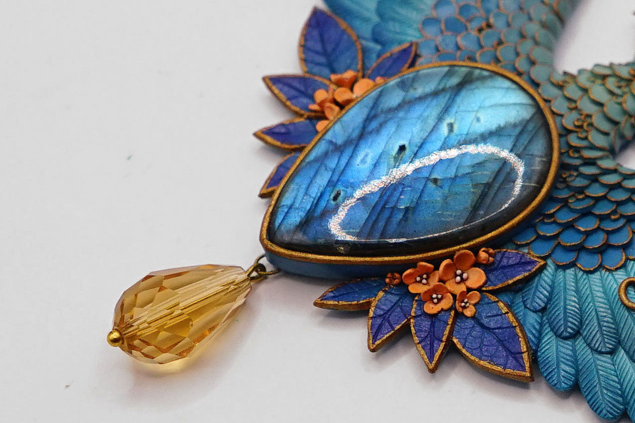 This statement necklace is meticulously handcrafted from polymer clay and embellished with a beautiful blue labradorite. The piece is primarily colored in shades of turquoise, with accents of orange and gold. It features intricate details and delicate botanical elements.