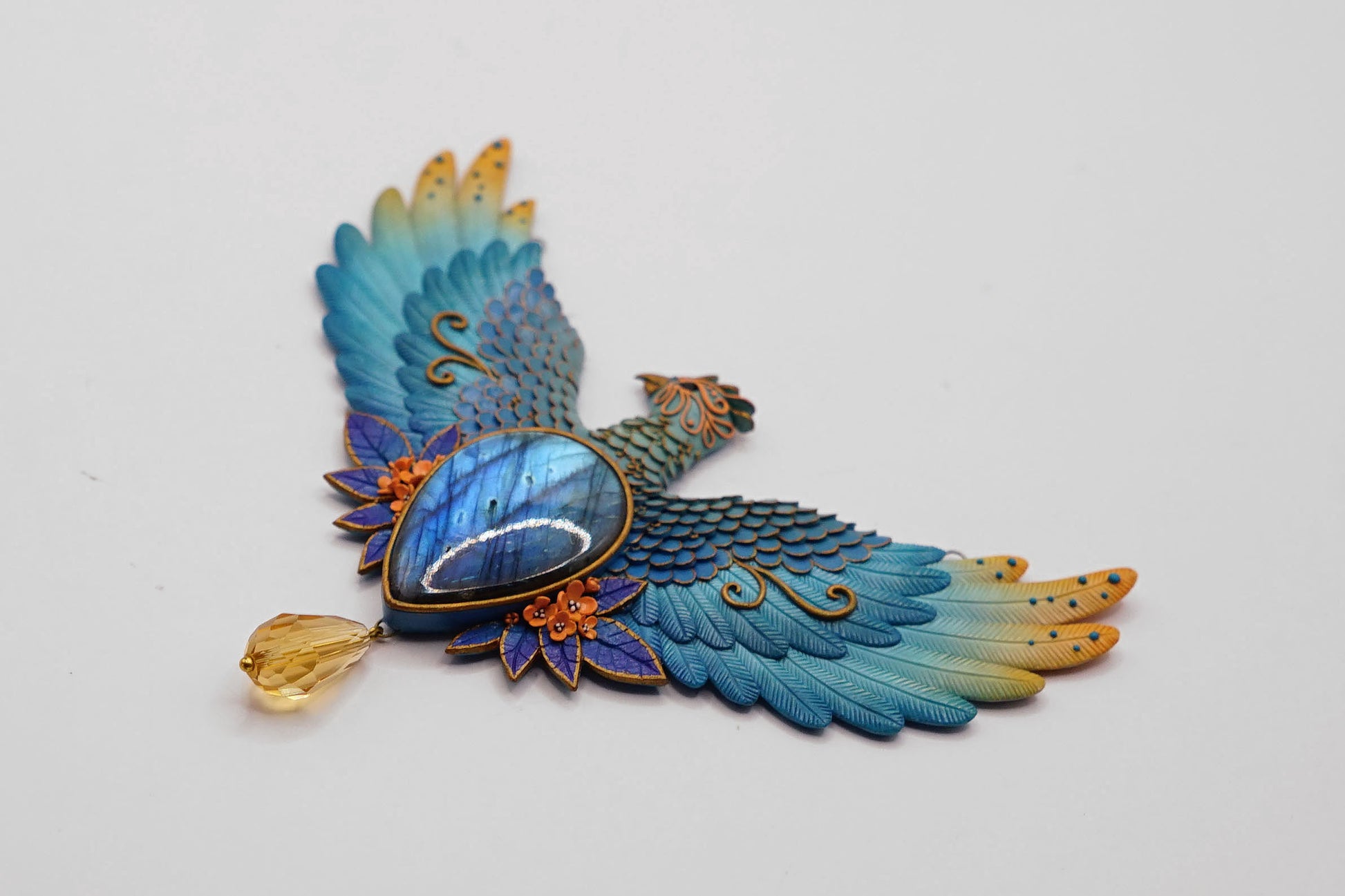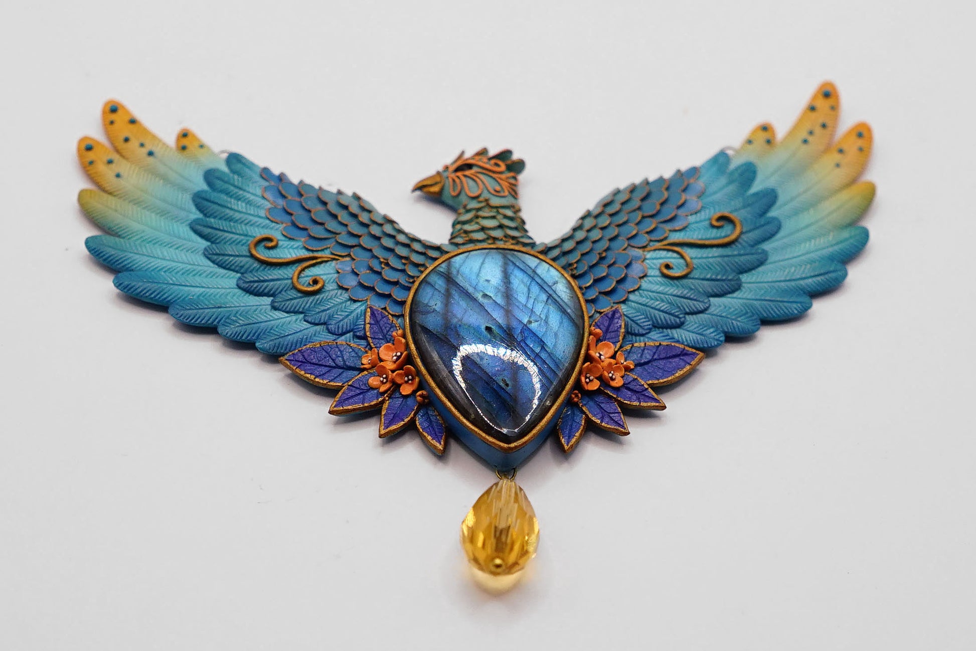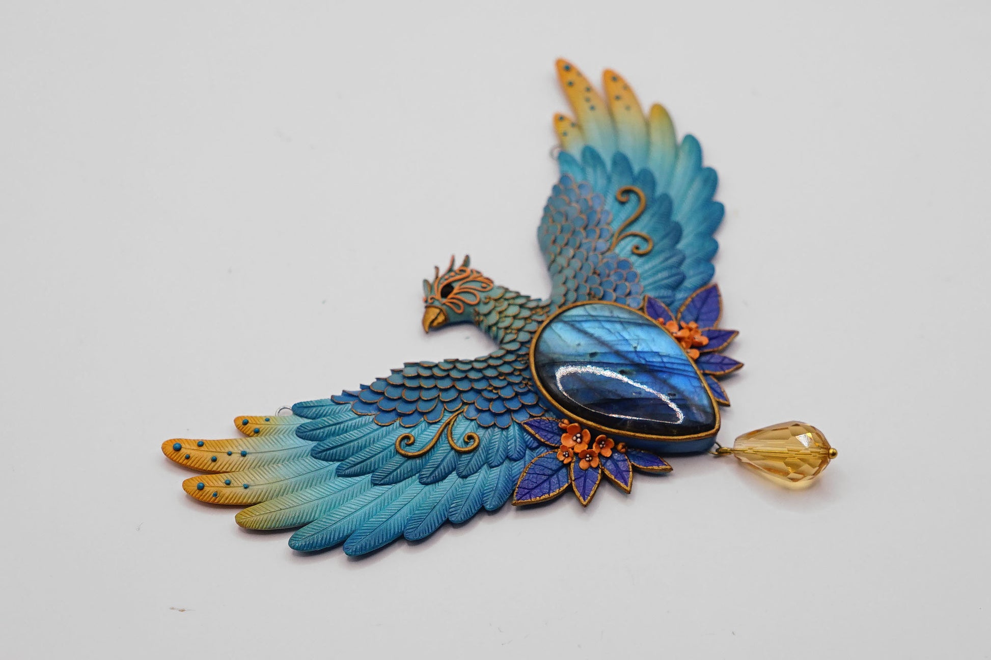 This statement necklace is meticulously handcrafted from polymer clay and embellished with a beautiful blue labradorite. The piece is primarily colored in shades of turquoise, with accents of orange and gold. It features intricate details and delicate botanical elements.