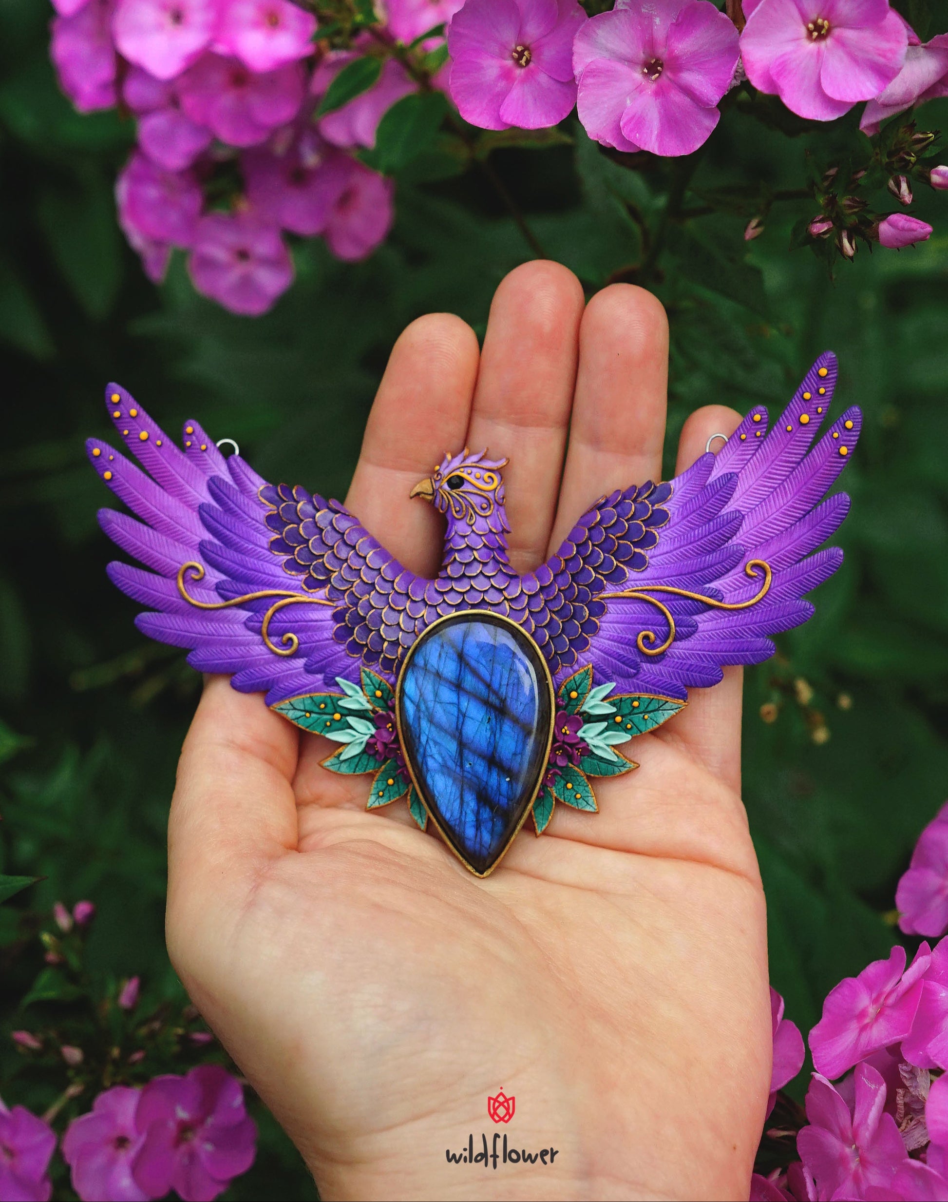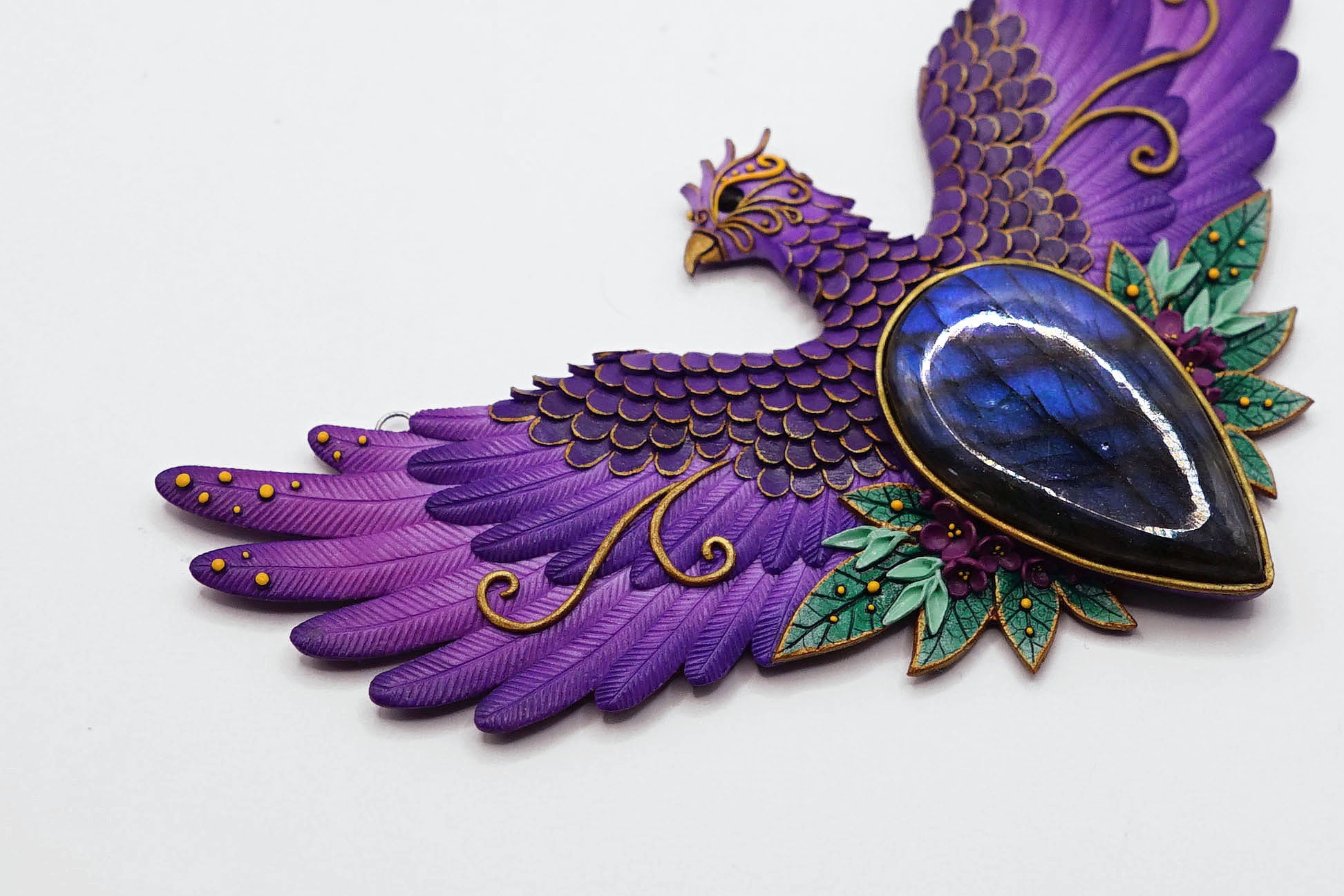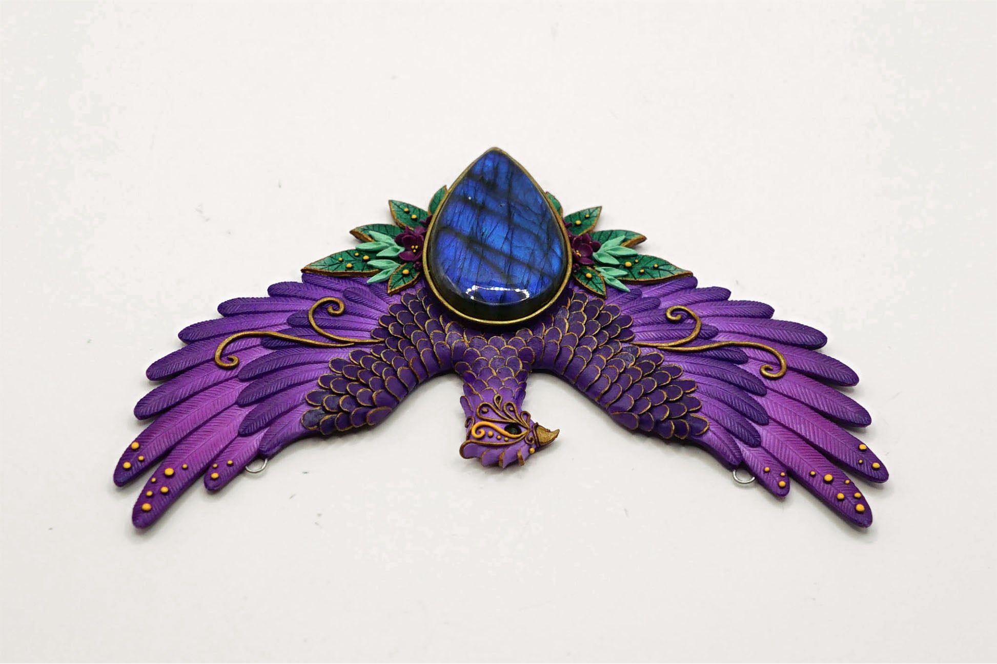 This statement necklace is meticulously handcrafted from polymer clay and embellished with a beautiful blue labradorite. It features intricate details and delicate botanical elements.