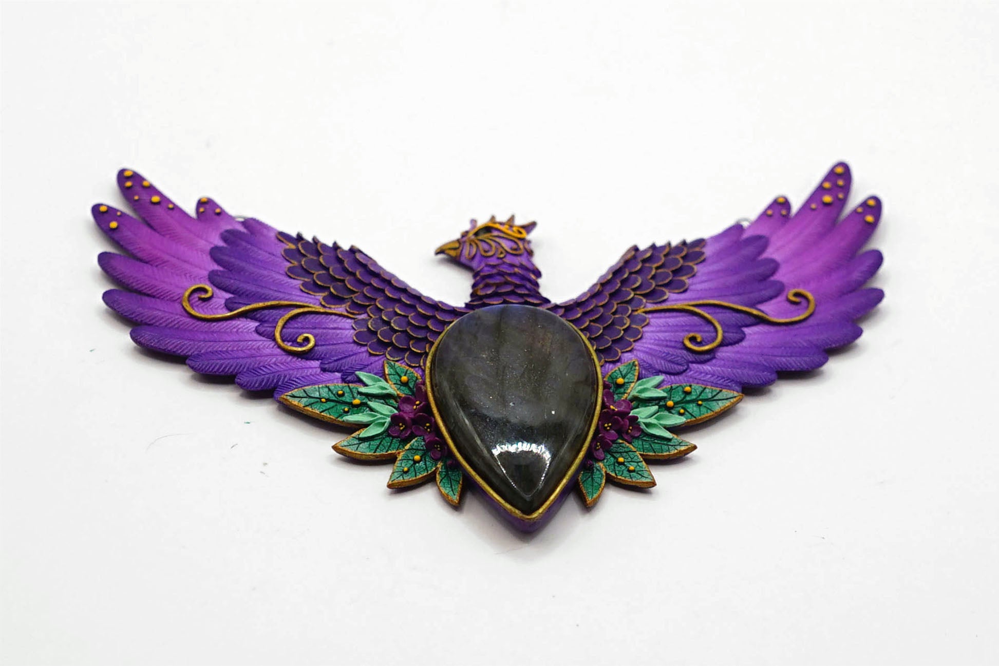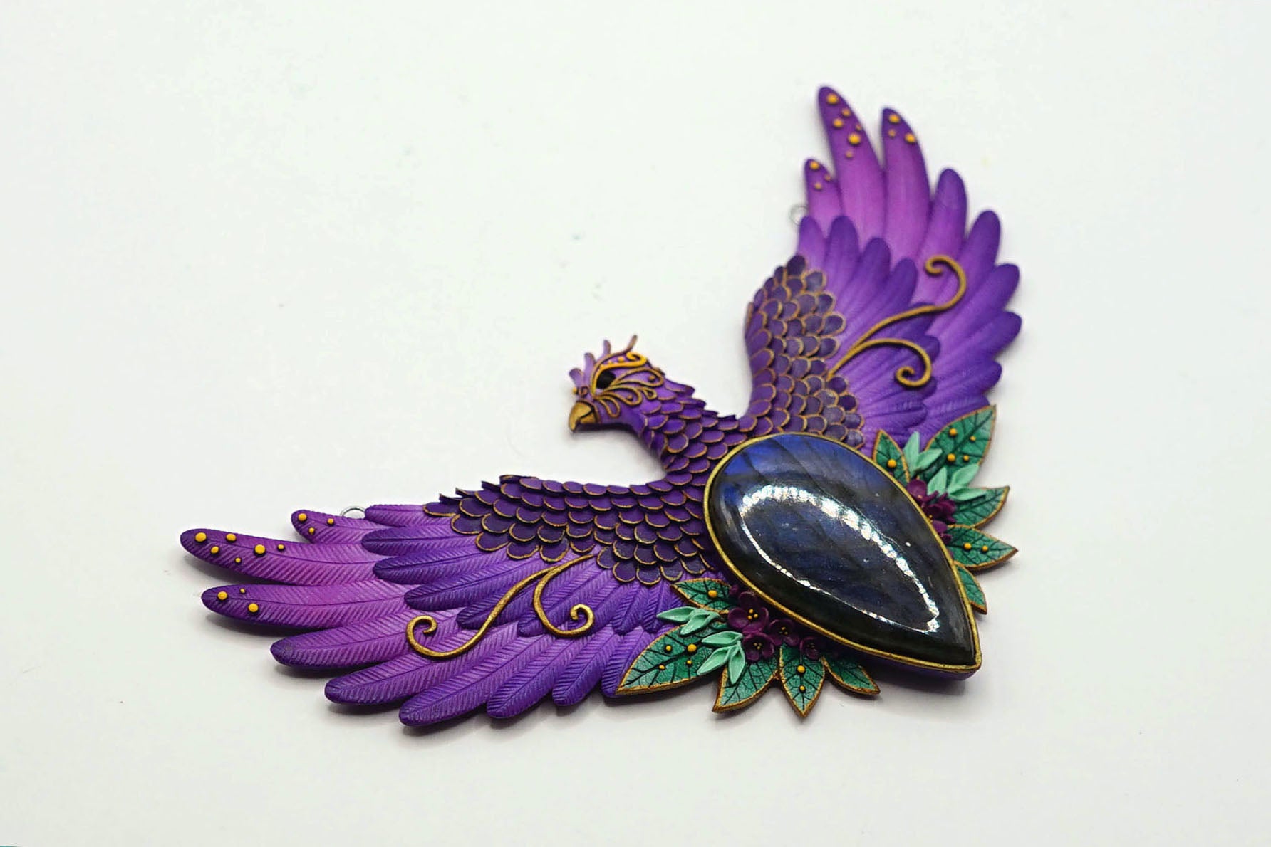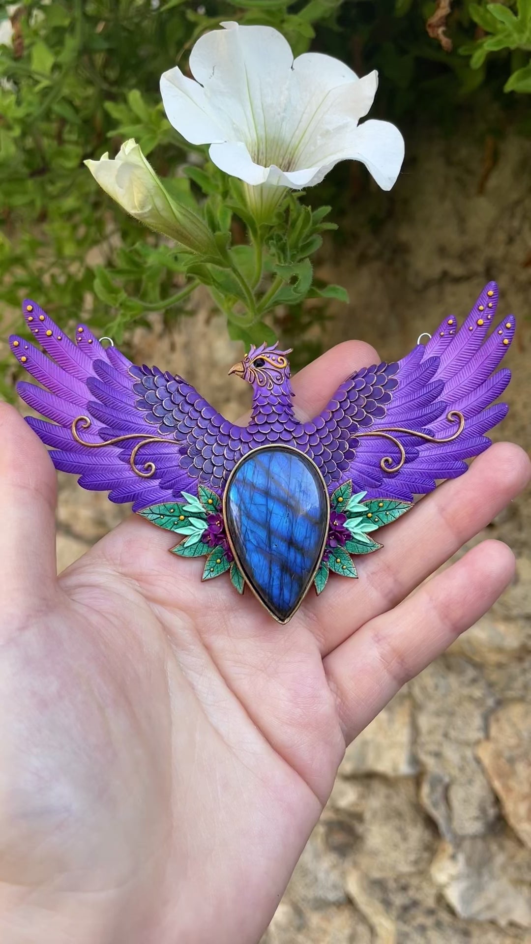 This statement necklace is meticulously handcrafted from polymer clay and embellished with a beautiful blue labradorite. It features intricate details and delicate botanical elements.